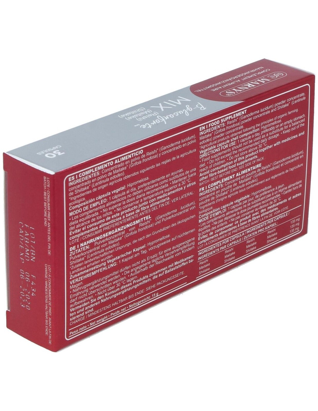 - Contiene extractos estandarizados de Shitake, Reishi y Maitake, que aportan compuestos naturales presentes en estas variedades.