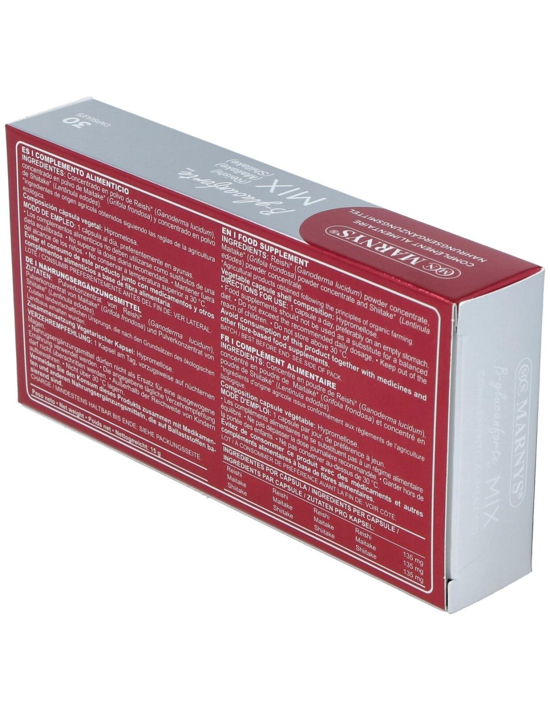 Mix Shitake-Reishi-Maitake 30Cap. de Marnys es un suplemento que combina extractos de tres tipos de hongos reconocidos por su uso tradicional. Está diseñado para personas interesadas en complementar su dieta con ingredientes naturales derivados de estos hongos.