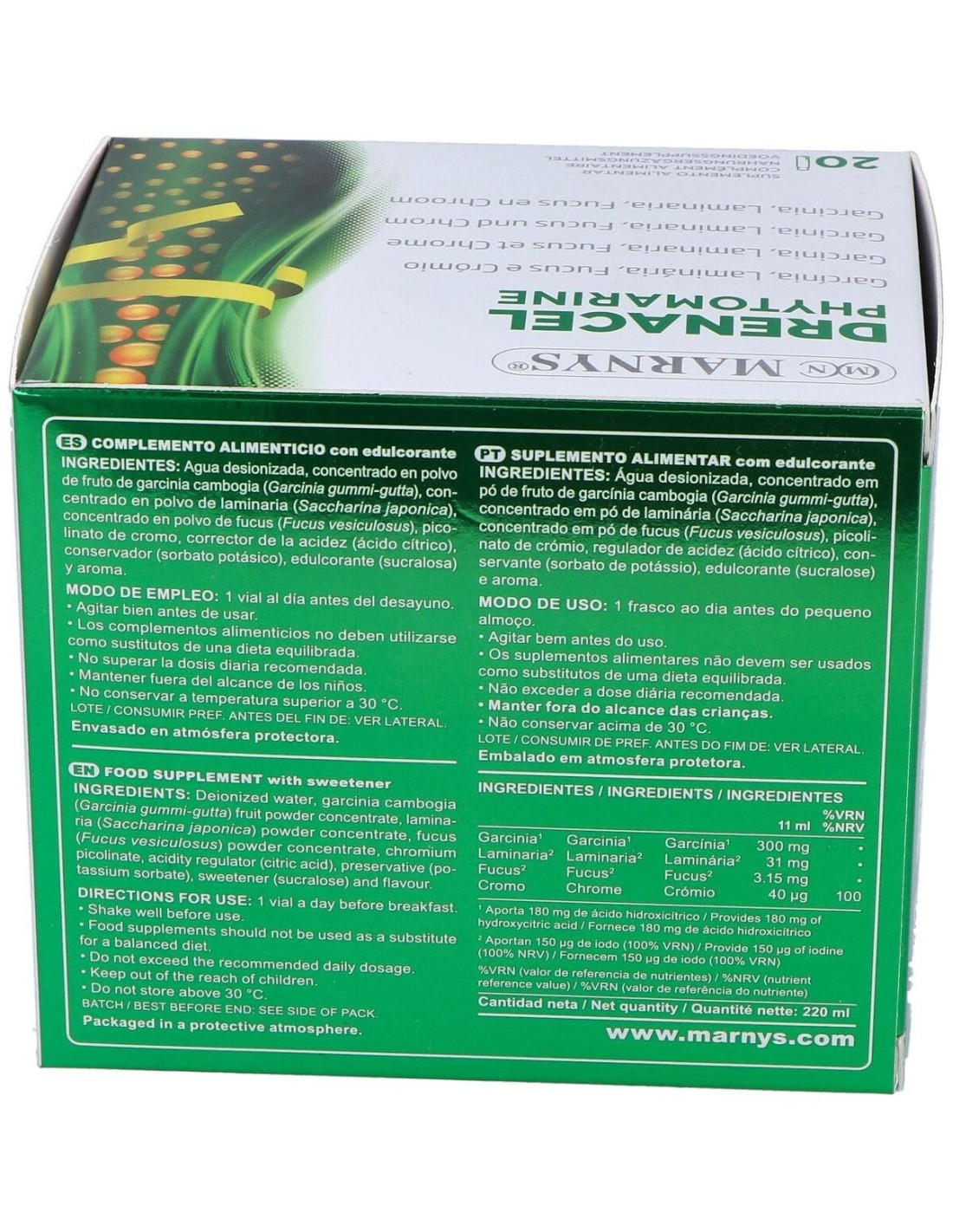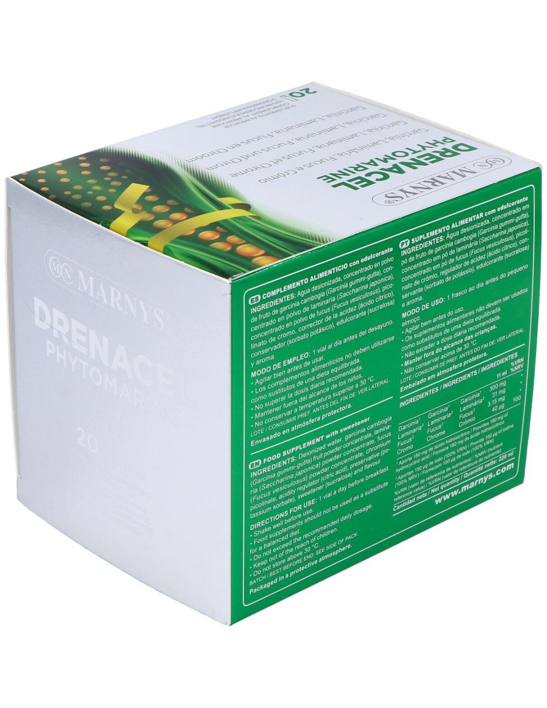 Drenacel Phytomarin 20Viales de Marnys es un complemento alimenticio para personas que buscan apoyar la eliminación de líquidos. Facilita el drenaje corporal gracias a su fórmula con ingredientes naturales marinos.