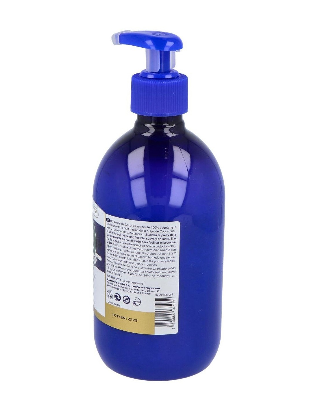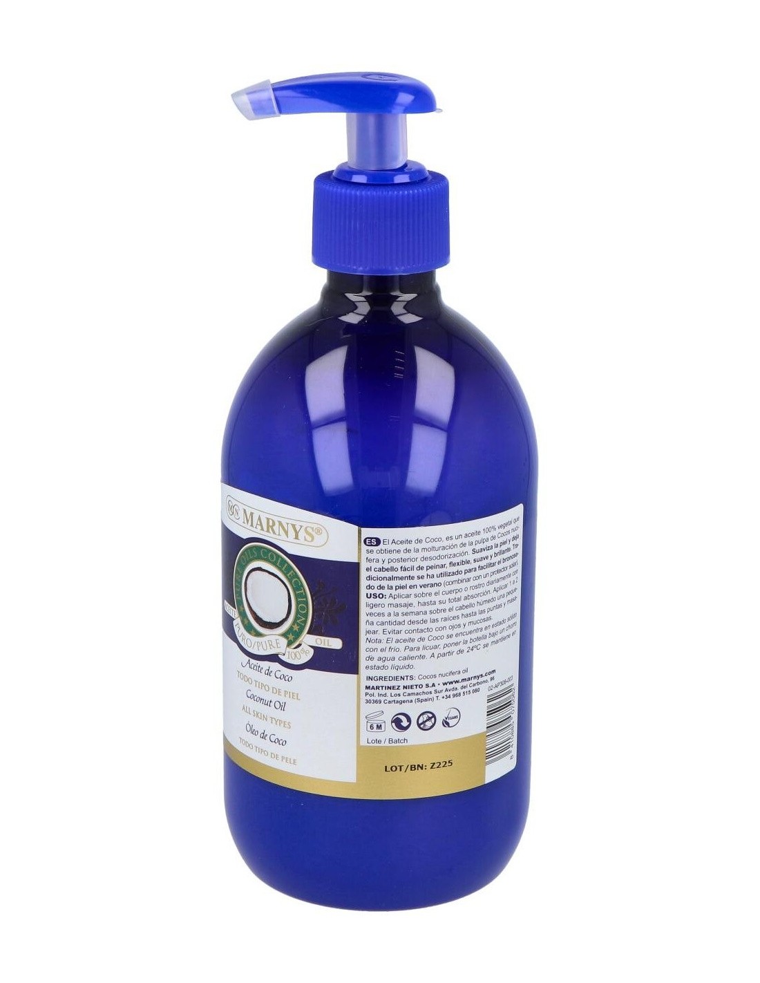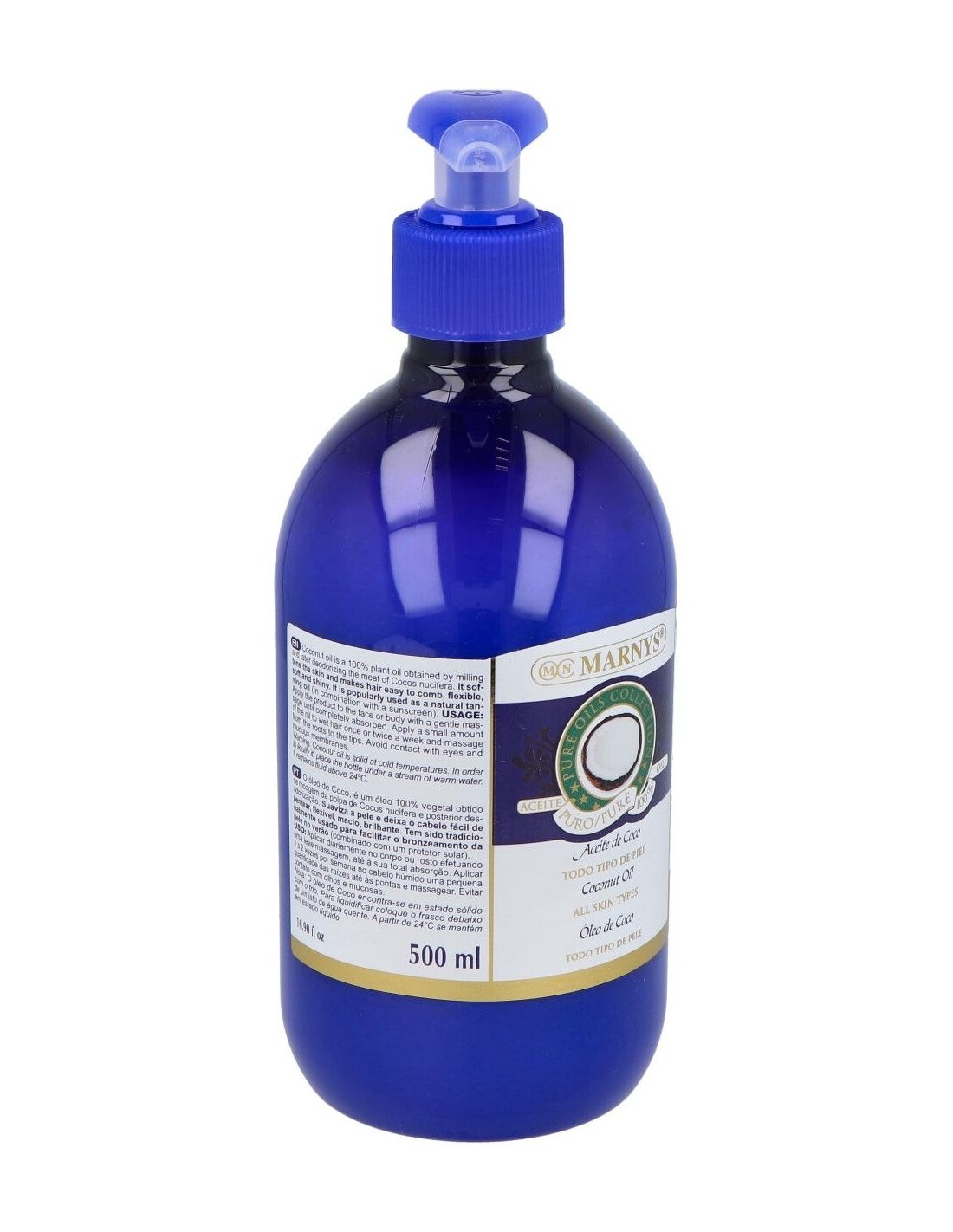 El aceite de coco de Marnys es un aceite 100% puro obtenido de la pulpa del coco (Cocos Nucifera) de excelentes propiedades hidratantes y nutritivas.
