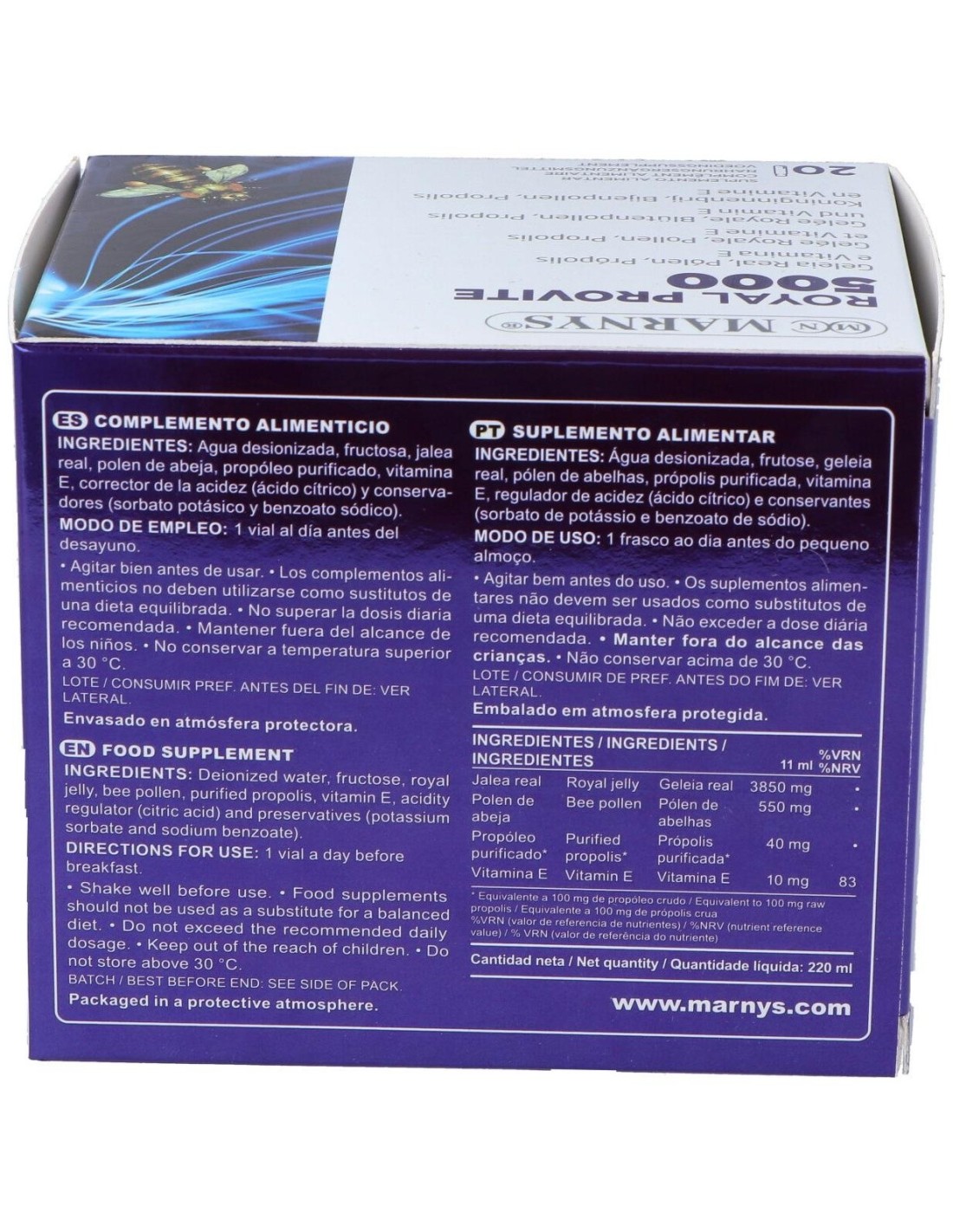 Agua desionizada, fructosa, jalea real, polen de abeja, propóleo purificado, vitamina E, corrector de la acidez (ácido cítrico) y conservadores (sorbato potásico y benzoato sódico).