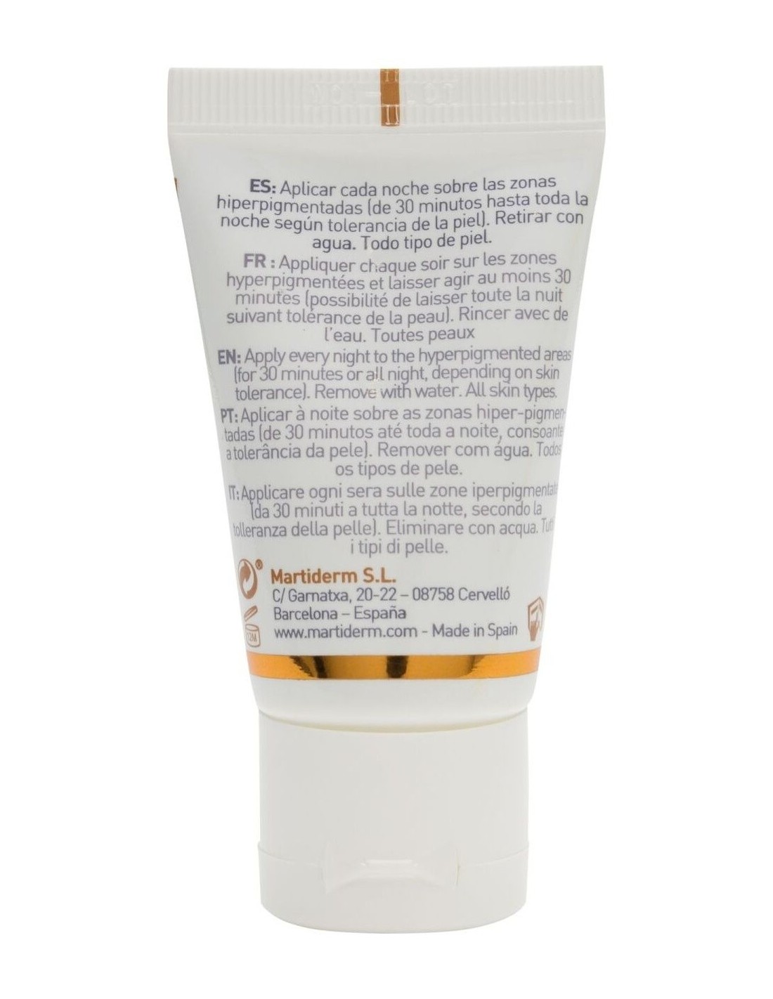 Uso externo.\ Aplicar por la noche sobre las zonas hiperpigmentadas a tratar.\ Dejar actuar durante 30 minutos.\ Incrementar la duración de 30 min hasta 2 horas gradualmente según tolerancia.\ Retirar con abundante agua.\ Aplicar un fotoprotector de muy alta protección durante el día.