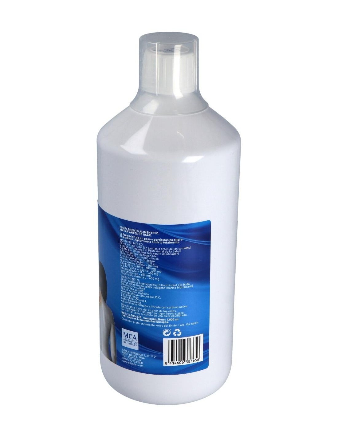 Complemento alimenticio bebible con base de Silicio Orgánico Biodisponible (Silinutriment LB) y enriquecido con glucosamina, condroitina, M.S.M, que contribuyen al normal mantenimiento de cartílago, tendones y ligamentos.