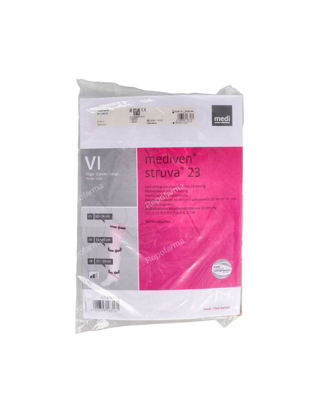 Las medias de vendaje tienen un campo de aplicación muy amplio para el tratamiento ambulatorio o en régimen de ingreso parcial de las trombosis en cirugía venosa y, en general, cuando se necesitan vendajes compresivos de las extremidades inferiores. Con una presión de 23 mmHg en el empeine, que va disminuyendo uniformemente hacia el muslo, mediven struva 23 es especialmente adecuada para la compresión breve directa posquirúrgica tras una intervención en las venas. Favorece el retorno venoso y evita la aparición de edemas y derrames sanguíneos.