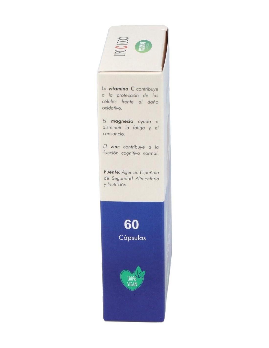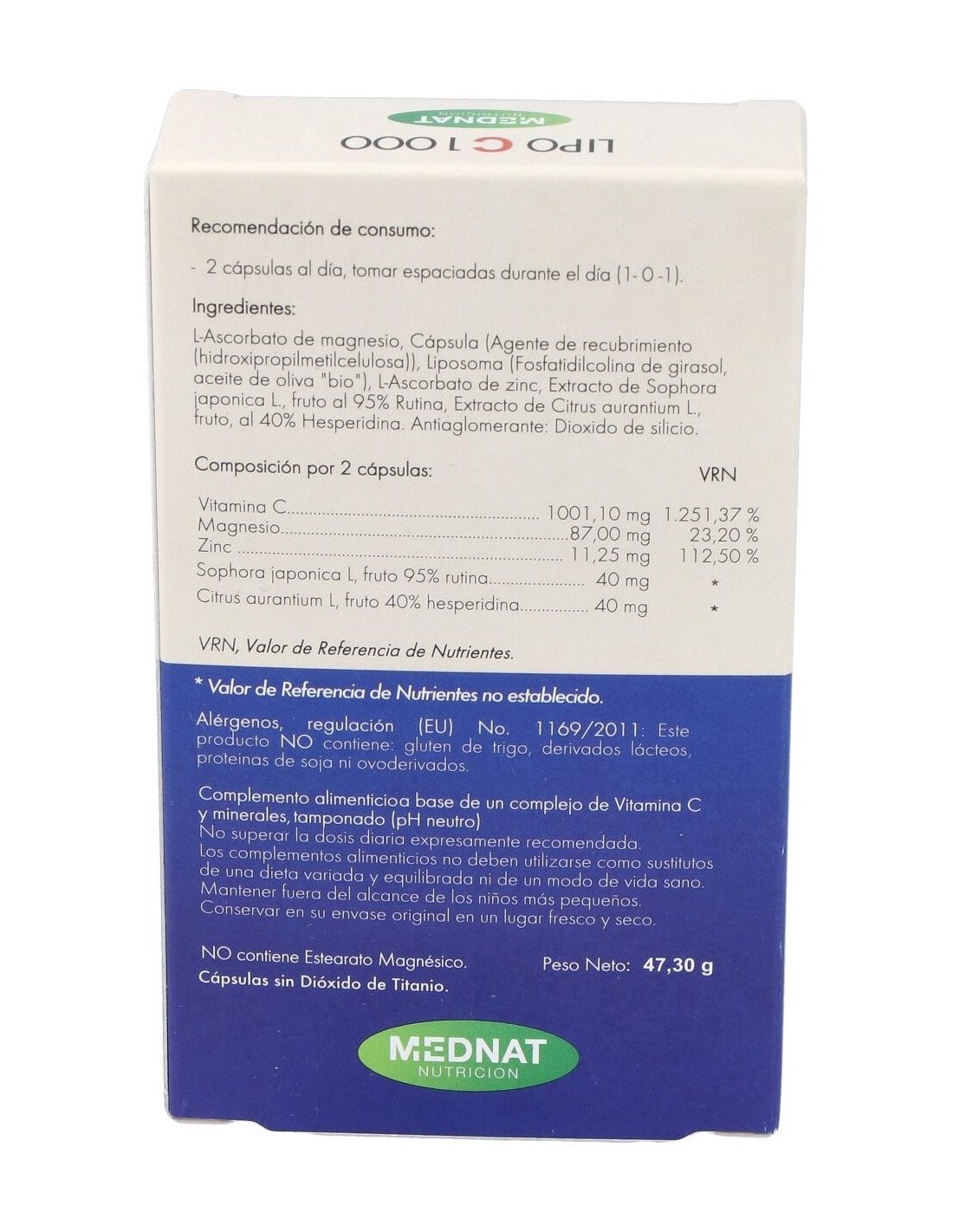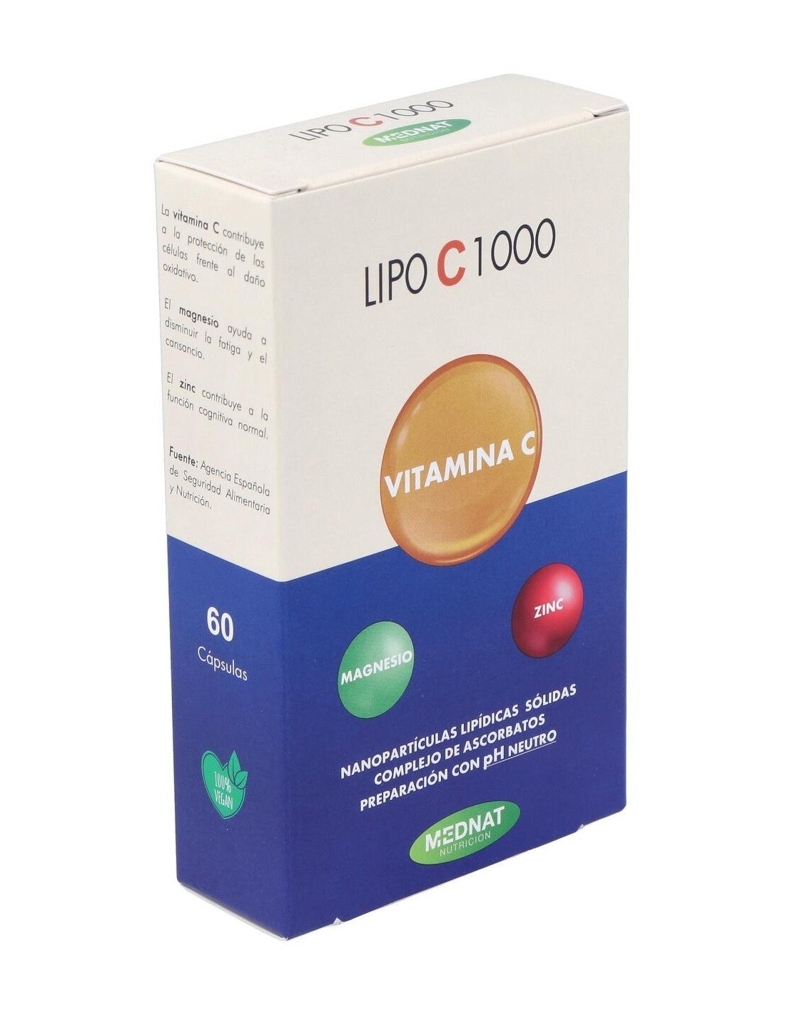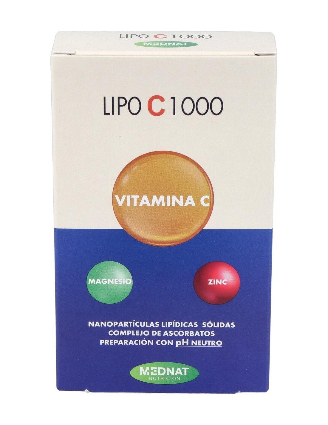 Lipo C 1000 de Mednat es un complejo de ascorbatos de formulación con pH neutro. No provoca ninguna acidez y aporta minerales imprescindibles como el Magnesio y el Zinc en porcentajes muy considerables. Su presentación es en base de nanopartículas lipídicas lo que permite un óptimo aprovechamiento.Principios activos: