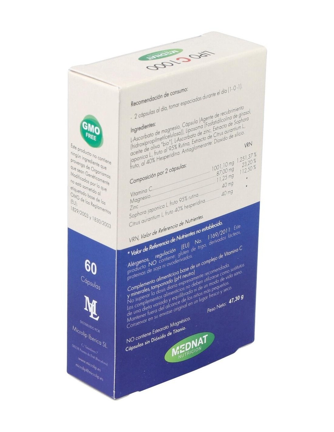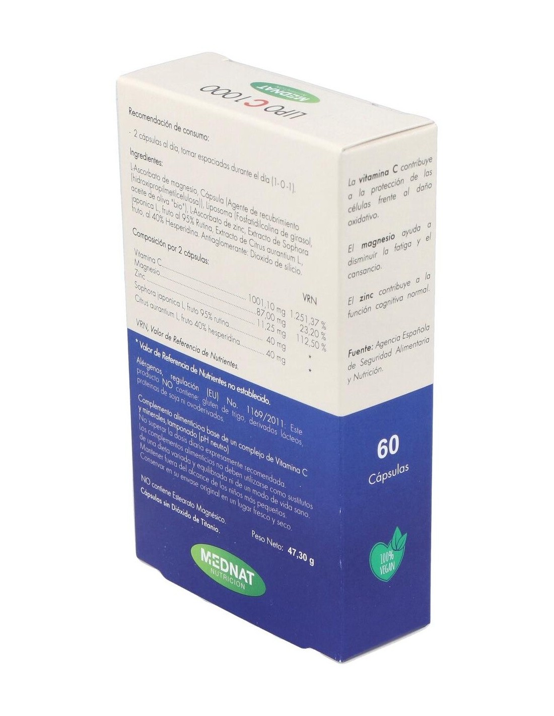 Ingredientes:L-Ascorbato de magnesio, Cápsula (Agente de recubrimiento (hidroxipropilmetilcelulosa)), Liposoma (Fosfatidilcolina de girasol, aceite de oliva "bio"), L-Ascorbato de zinc, Extracto de Sophora japonica L., fruto al 95% Rutina, Extracto de Citrus aurantium L., fruto, al 40% Hesperidina. Antiaglomerante: Dioxido de silicio.Modo de empleo:Tomar 2 cápsulas al día, espaciadas durante el día.Presentación:Envase de 60 cápsulas vegetales.Recomendaciones y advertencias:No contiene gluten de trigo, derivados lácteos, esterara magnésio, proteínas de soja ni ovoderivados. Cápsulas sin dióxido de titanio.
