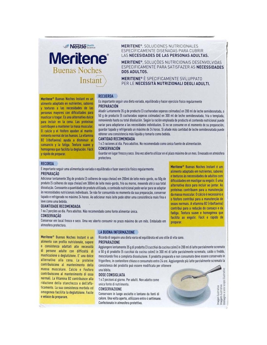 Una ración puede elaborarse con 35 g (3 cucharadas soperas colmadas) o 50 g (5 cucharadas soperas colmadas) de producto variando así el contenido nutricional y la textura en función de las necesidades de cada persona.