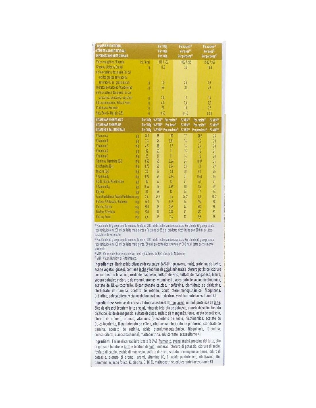 Harinas hidrolizadas de cereales (66%) (trigo, avena y maíz), proteínas de leche, aceite vegetal (girasol, contiene leche y lecitina de soja), minerales (cloruro potásico, cloruro sódico, fosfato bicálcico, óxido de magnesio, sulfato de zinc, sulfato de manganeso, hierro, yoduro potásico, cloruro de cromo), aromas, vitaminas (L-ascorbato sódico, nicotinamida, acetato de D-alfa-tocoferilo, D-pantotenato cálcico, riboflavina, clorhidrato de piridoxina, clorhidrato de tiamina, acetato de retinilo, ácido pteroilmonoglutámico, filoquinona, D-biotina, colecalciferol y cianocobalamina), maltodextrina y edulcorante (acesulfamo K).