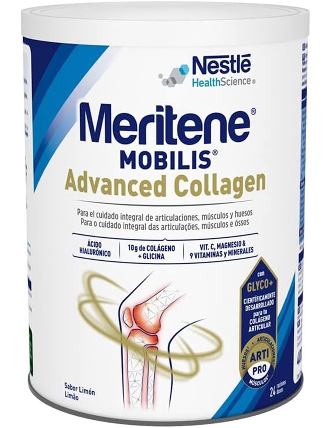 Meritene Mobilis Advanced Collagen de Meritene es un complemento alimenticio que llega la nueva generación de complementos de colágeno, científicamente desarrollada para contribuir en facilitar la movilidad y flexibilidad, limitada con el paso de la edad o en situaciones de molestias articulares.La novedosa combinación Glyco+ contiene Péptidos de Colágeno y Glicina, más vitamina C para contribuir a la formación normal de colágeno. Además, contiene otras vitaminas y minerales que ayudan al mantenimiento integral de las articulaciones, músculos y huesos.Indicaciones: