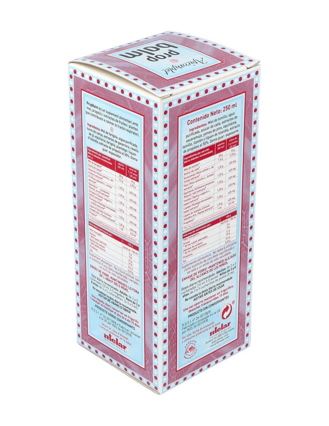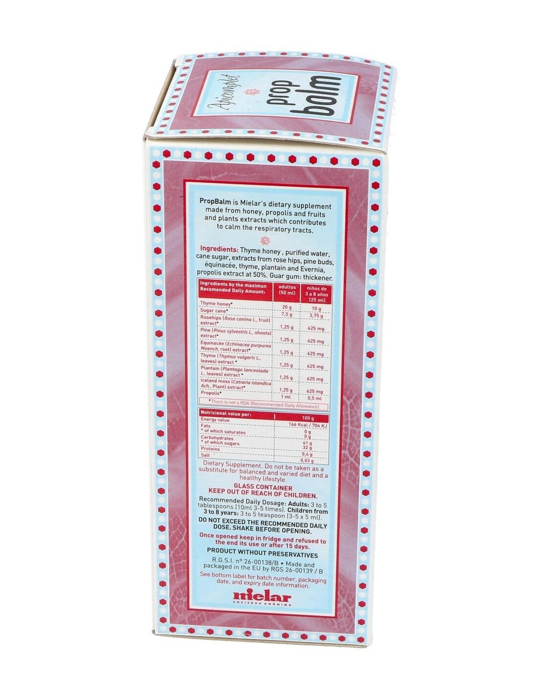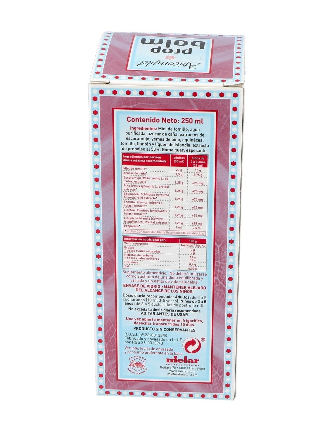 Miel de tomillo, azúcar integral de caña y extractos de propóleos, equinácea, tomillo, escaramujo, yemas de pino, llantén y liquen de Islandia.