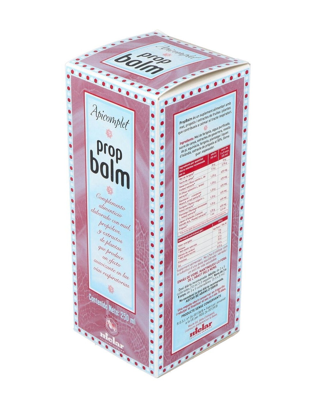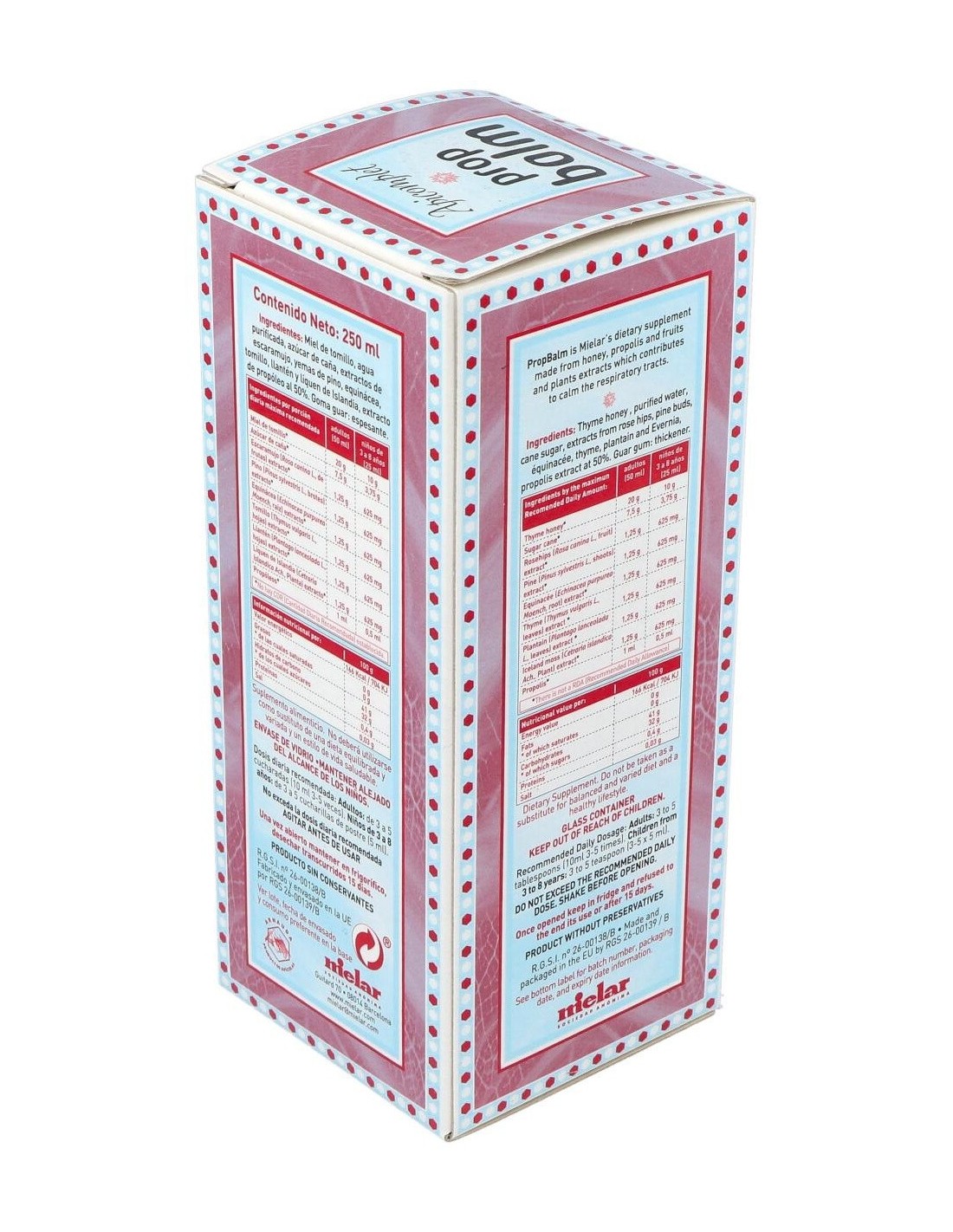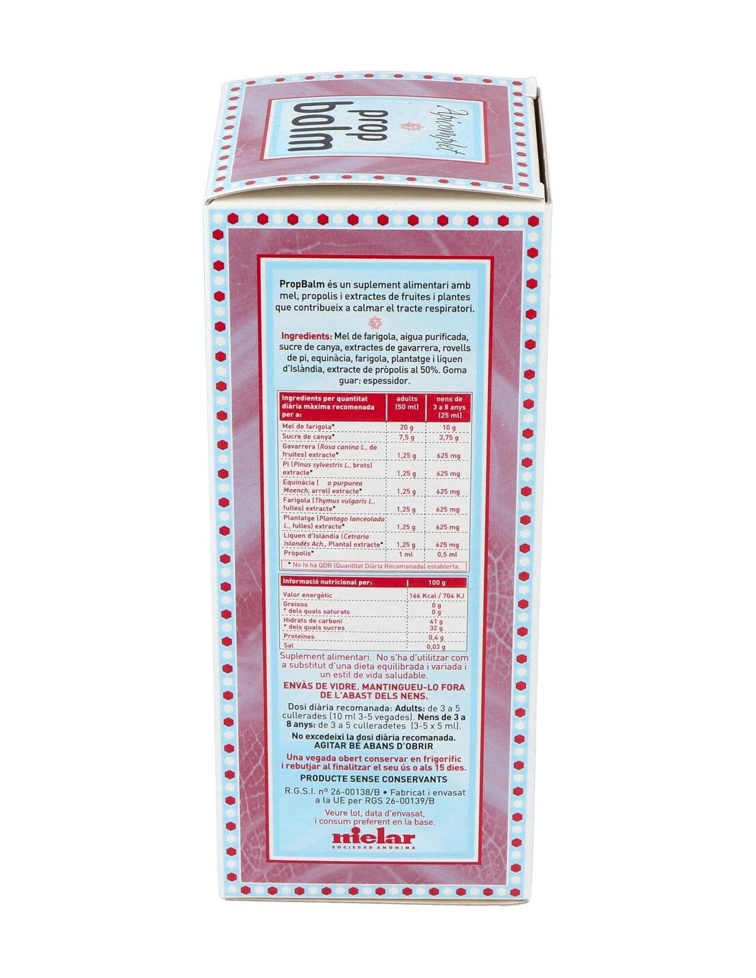 Miel de tomillo, azúcar integral de caña y extractos de propóleos, equinácea, tomillo, escaramujo, yemas de pino, llantén y liquen de Islandia.