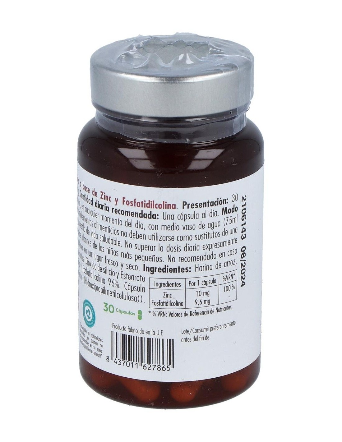 Bisglicinato de Zinc (10 mg de Zinc, 100%VRN), Aceite de Oliva y Fosfatildilcolina (96%) 9,6 mg. Harina de Arroz,. Antiaglomerantes (Estearato de Magnesio y Dióxido de silicio). Cápsula vegetal (Agente de recubrimiento (Hidroxipropilmetilcelulosa).
