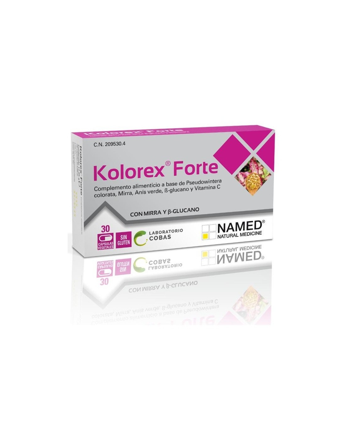 Kolorex Horopito (Pseudowintera (Pseudowintera colorata Raoul Dandy) polvo de hojas), anís verde (Pimpinella anisum L., maltodextrina) fruto e.s. tit. 0,5% en aceite esencial, cápsula (agente de recubrimiento: hidroxipropilmetilcelulosa), vitamina C (ácido L- ascórbico, agente de carga: etilcelulosa), betaglucano, mirra (Commiphora myrrha (Nees) Engl., proteína de guisante, proteína de arroz) oleo goma-resina e.s. tit. 3% en furanodienos, antiaglomerante: sales magnésicas de ácidos grasos.\ \ Por 2 cápsulas:\ Pseudowintera 350 mg\ Anís verde 290 mg\ Mirra e.s 100 mg\ B-glutano 100 mg\ Vitamina C 90 mg