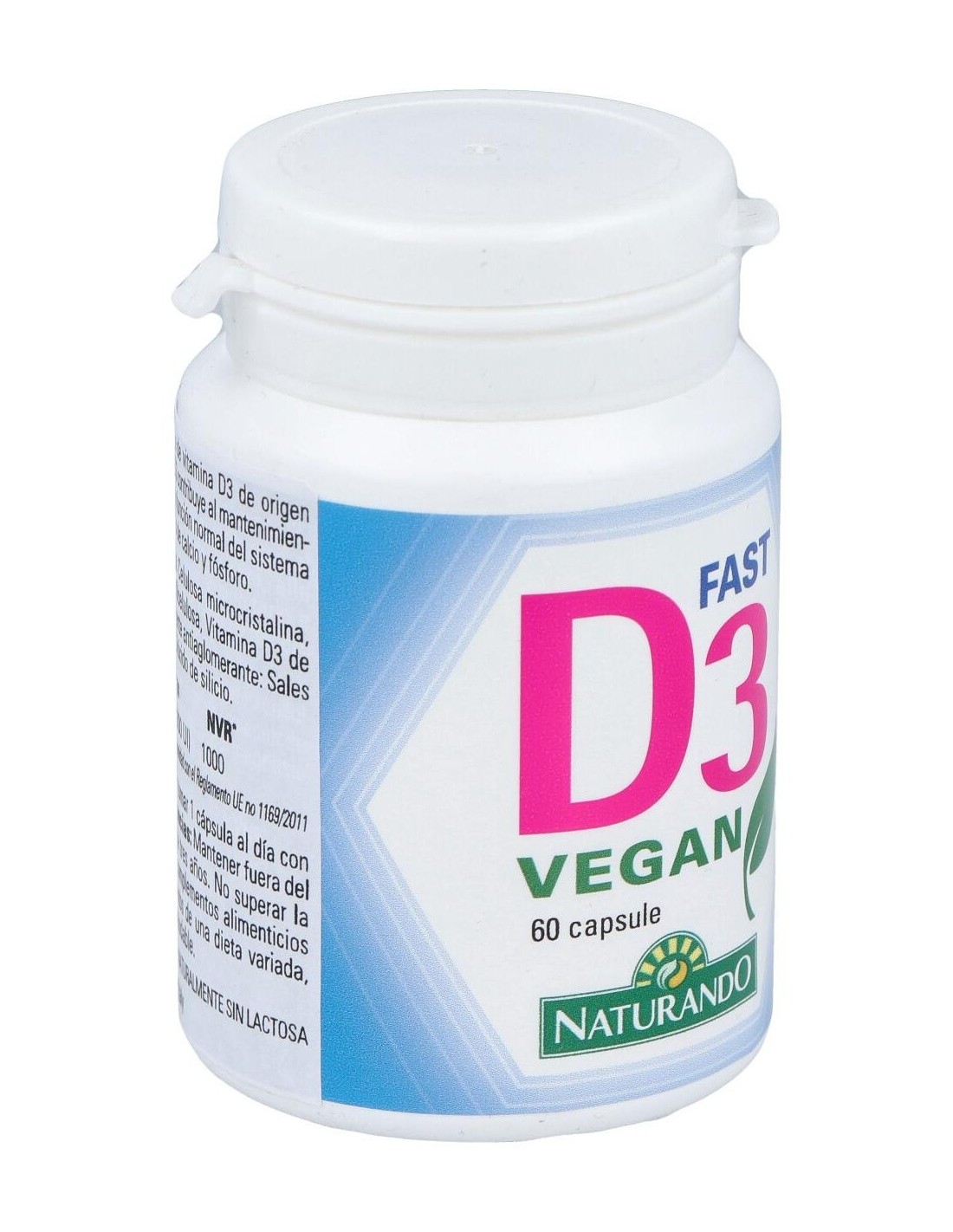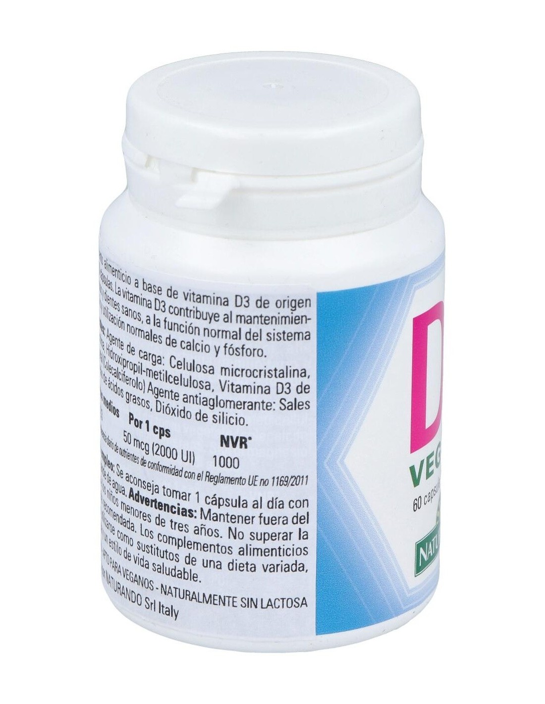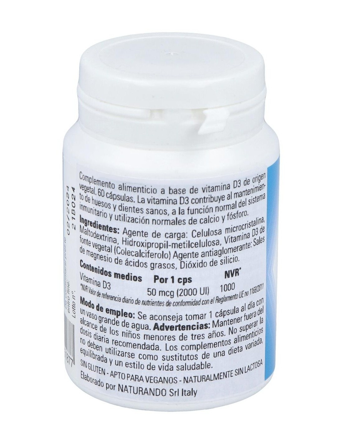 Vitamina D proveniente de fuente vegetal. La vitamina D3 contribuye al mantenimiento de huesos y dientes en condiciones normales, a la función normal del sistema inmunológico, a la absorción y utilización normales de calcio y fósforo y al mantenimiento de la función muscular normal. Producto vegano.
