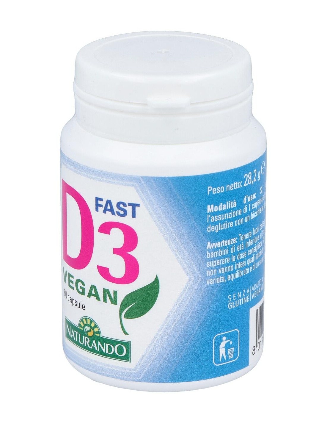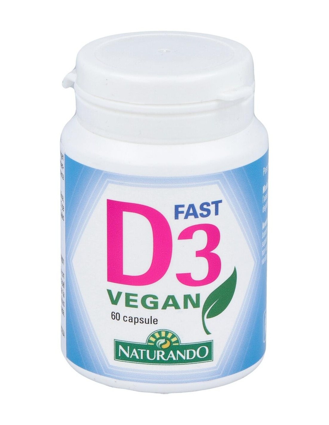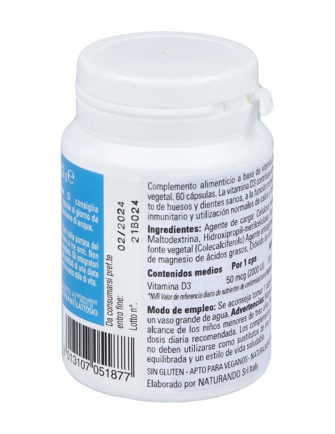 Vitamina D proveniente de fuente vegetal. La vitamina D3 contribuye al mantenimiento de huesos y dientes en condiciones normales, a la función normal del sistema inmunológico, a la absorción y utilización normales de calcio y fósforo y al mantenimiento de la función muscular normal. Producto vegano.