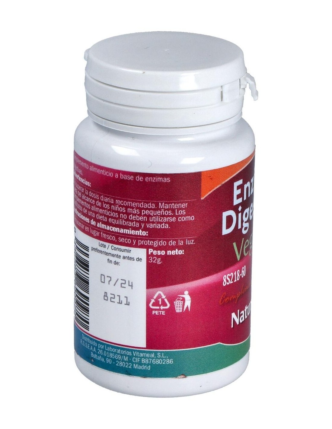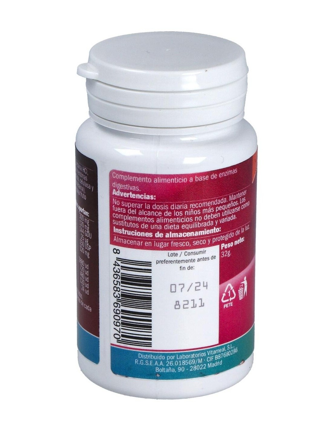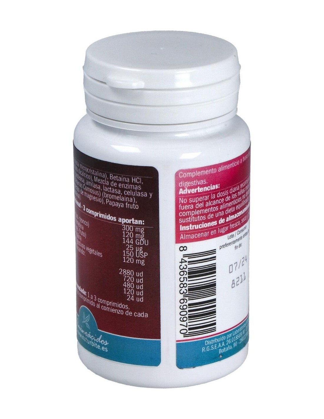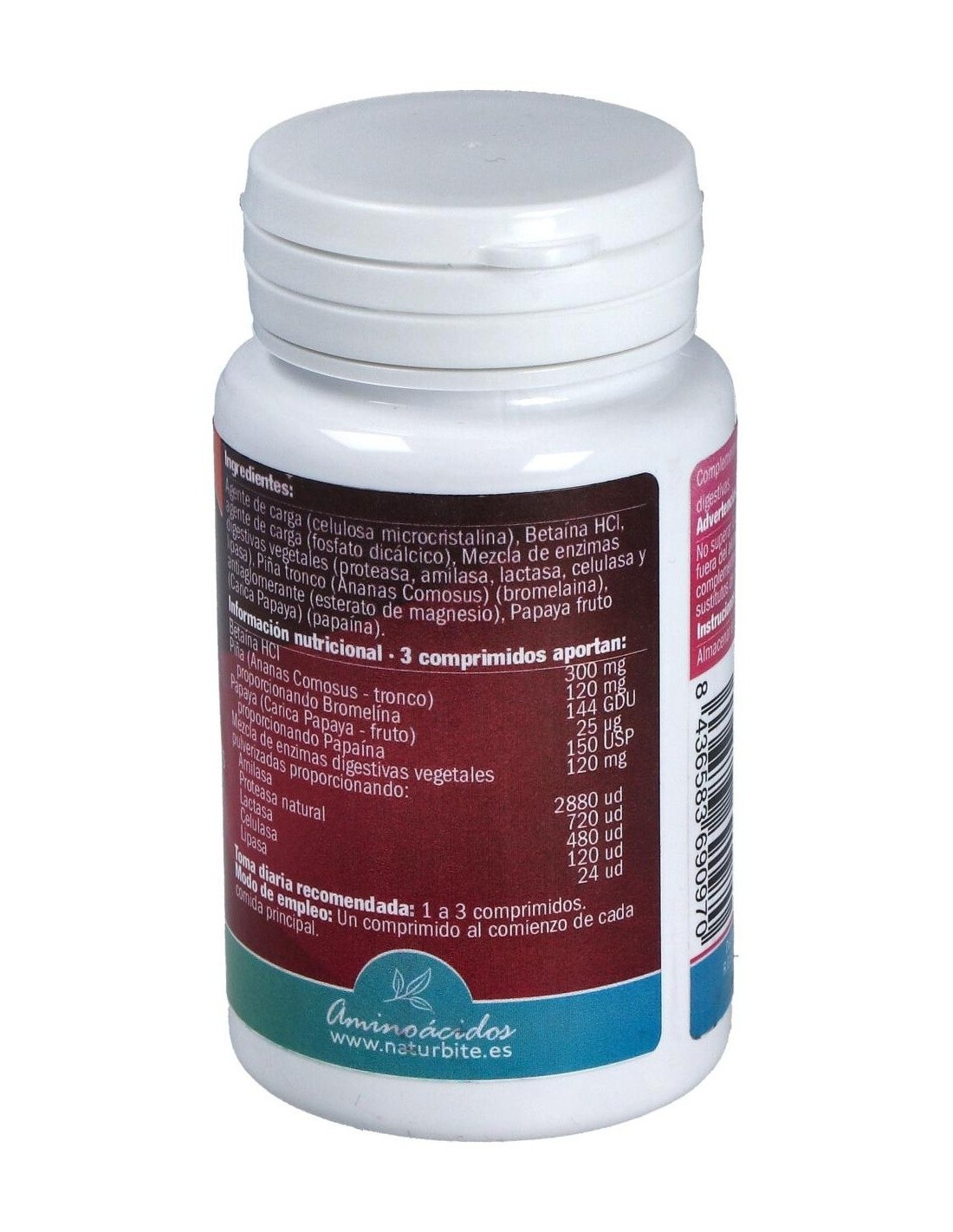 Celulosa microcristalina, Betaina HCI, fosfato dicálcico, mezcla de enzimas digestivas vegetales (proteasa, amilasa, lactasa, celulasa y lipasa), piña tronco, bromelaina, estearato de magnesio, papaya fruto, papaina.
