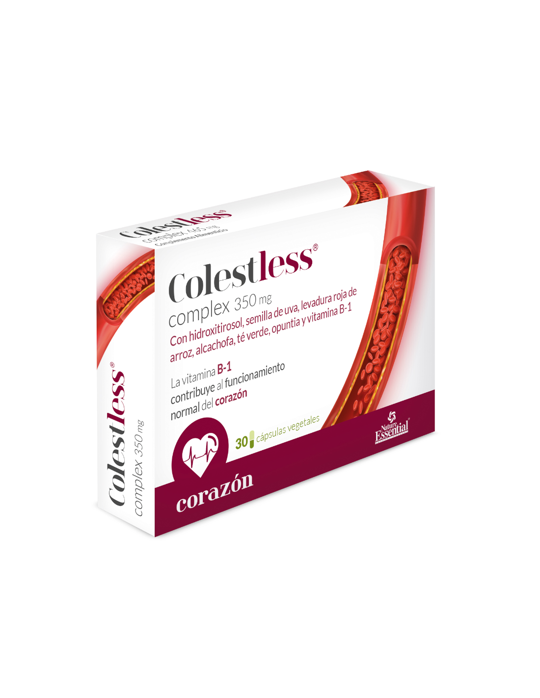 Colestless® 350 mg cápsulas vegetales de Nature Essential Blíster está formulada con hidroxitirosol, semilla de uva, levadura roja de arroz, alcachofa, té verde, opuntia y vitamina B-1 que tienen propiedades que ayudan a bajar el colesterol, ayuda al metabolismo y favorecen el buen funcionamiento del sistema circulatorio y del corazón.