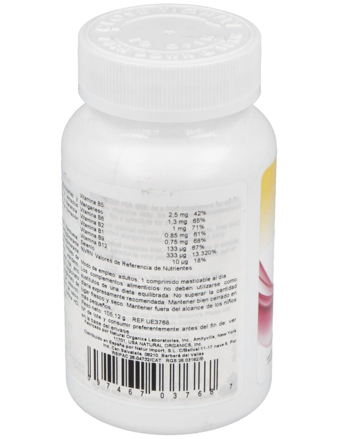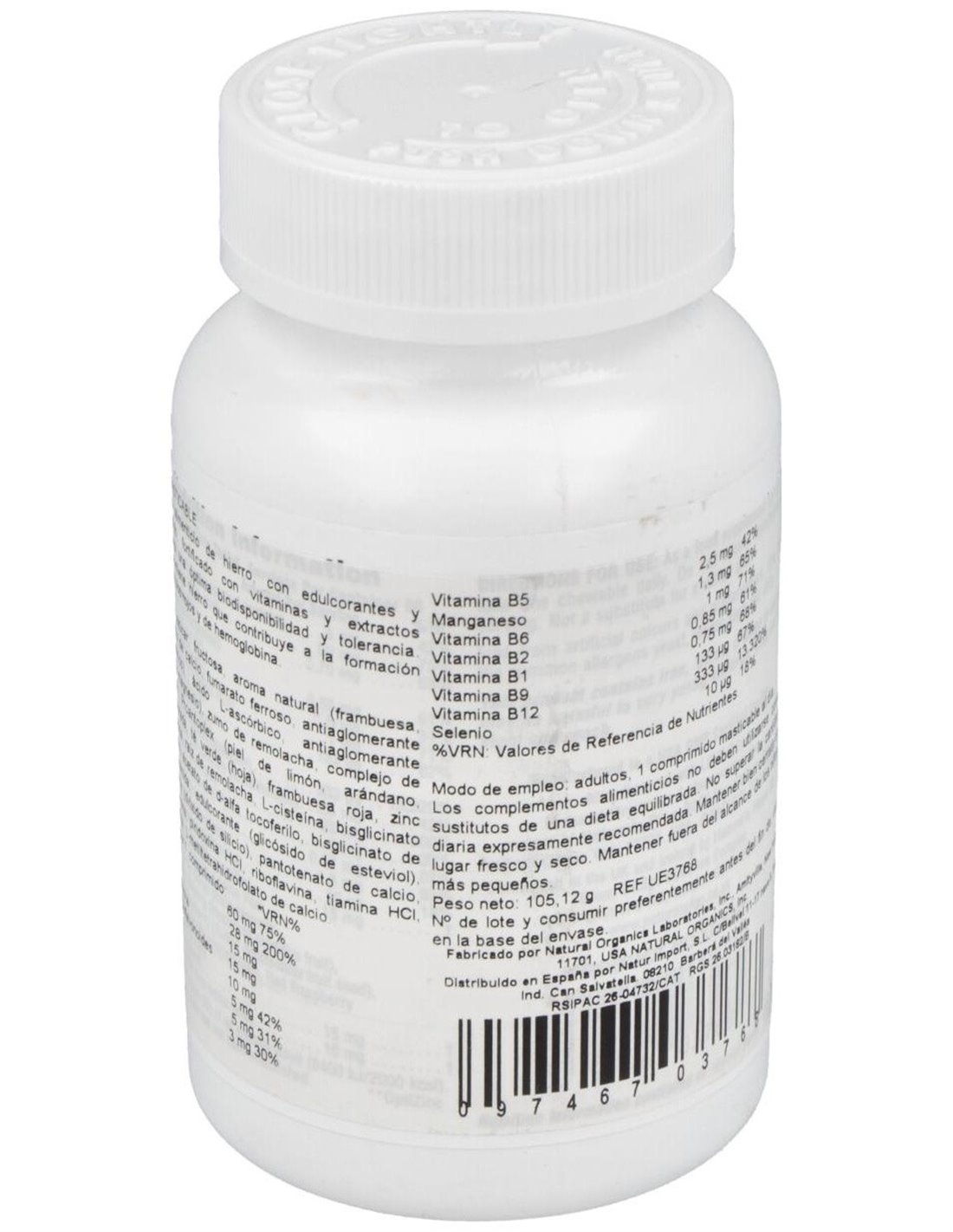 Azúcar, fructosa, aroma natural (frambuesa, cereza), citrato de calcio, fumarato ferroso, antiaglomerante (ácido esteárico),ácido L-ascórbico, antiaglomerante (estearato de magnesio), zumo de remolacha, complejo bioflavonoides/proantoplex (piel de limón, arándano (fruto), frambuesa morada (fruto), té verde (hoja), frambuesa roja (fruto), zinc L- monometionina, raíz de remolacha, L-cisteína, bisglicinato de manganeso, acetato de d-alfa tocoferilo, bisglicinato de cobre, niacinamida, edulcorante (glicósidos de esteviol), antiaglomerante (dióxido de silicio), pantotenato de calcio, L-selenometionina, piridoxina HCI, riboflavina, tiamina HCl, metilcobalamina, L-metiltetrahidrofolato de calcio.