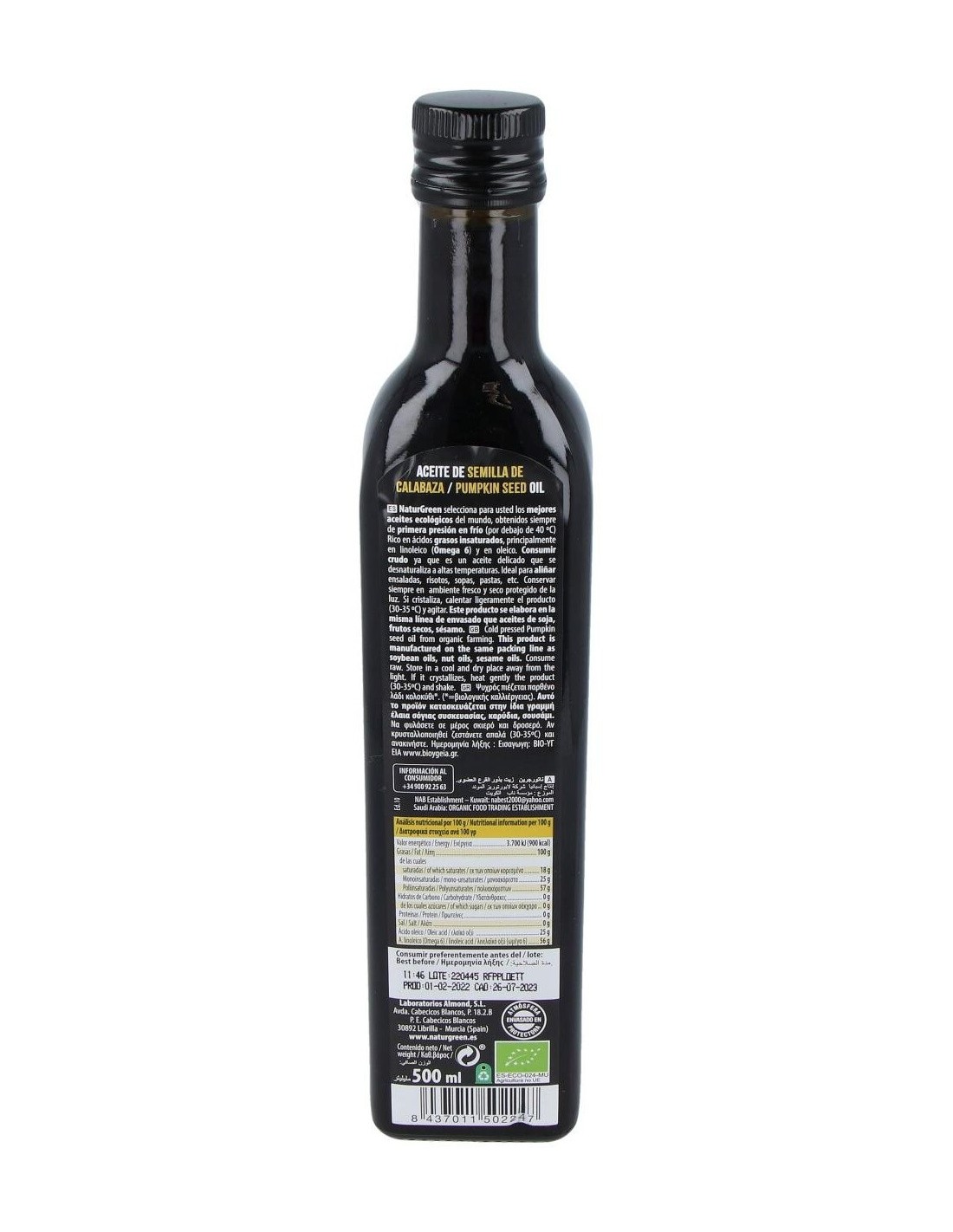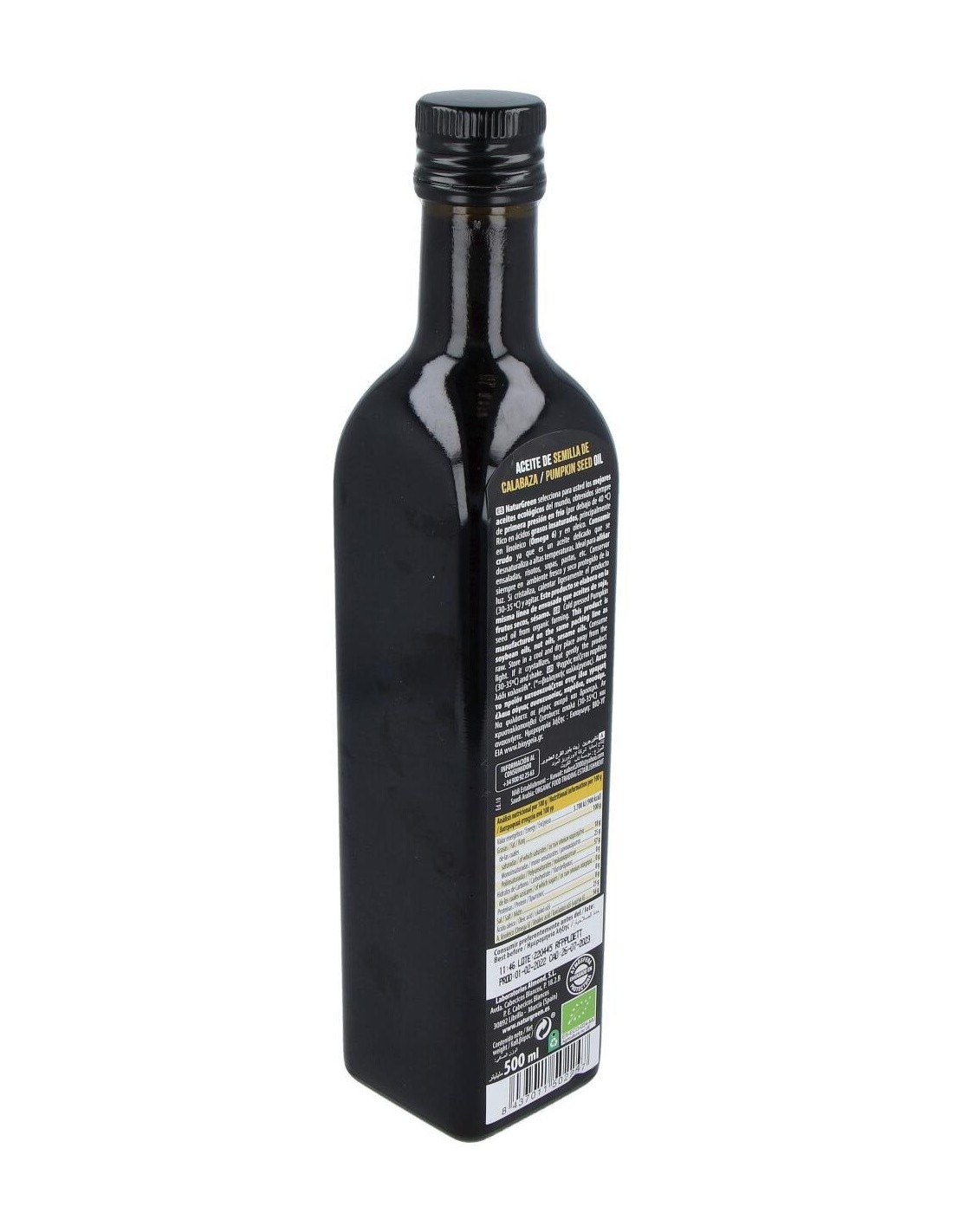Ingredientes:100% Aceite de semillas de calabaza ecológico.Valor nutricional por 100 gramos:
