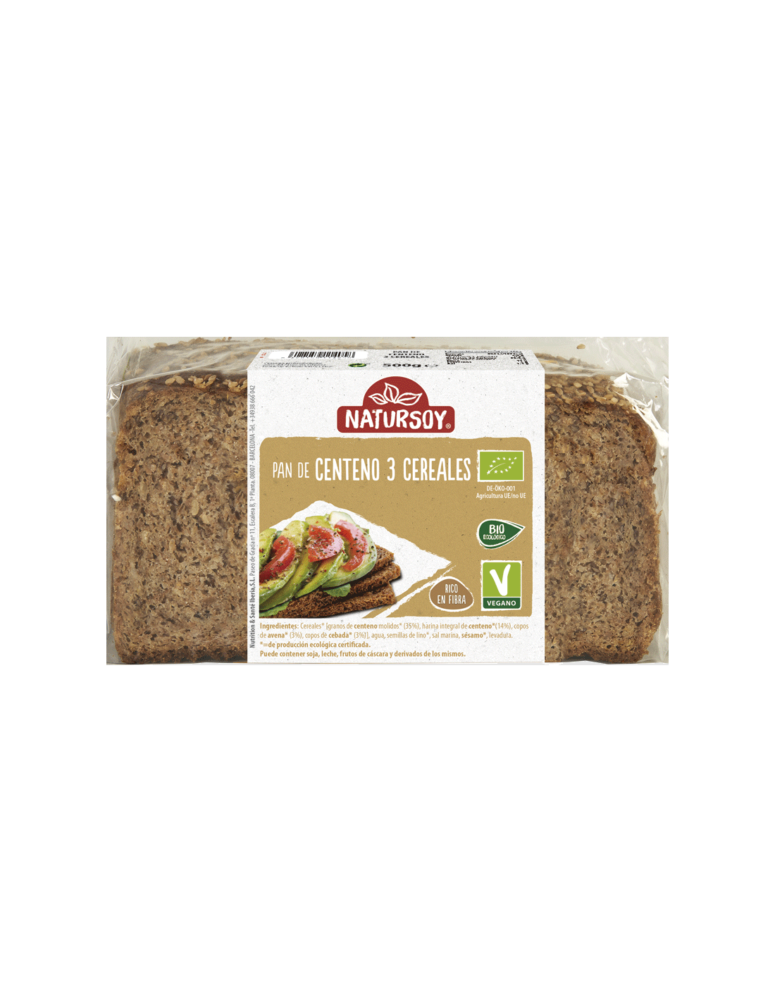 Pan Tres Cereales Eco 500g de Natursoy es un pan integral ecológico elaborado con harinas de trigo, centeno y espelta.