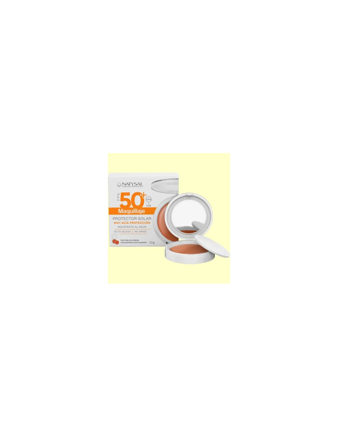 Haz clic en ?Agregar al carrito? y experimenta la diferencia de un maquillaje que protege y embellece al instante. No esperes más para sentir la confianza que brinda un rostro cuidado y protegido con el Maquillaje Solar Compacto Fps50+ 10 gr. de Natysal. ¡Tu piel te lo agradecerá!