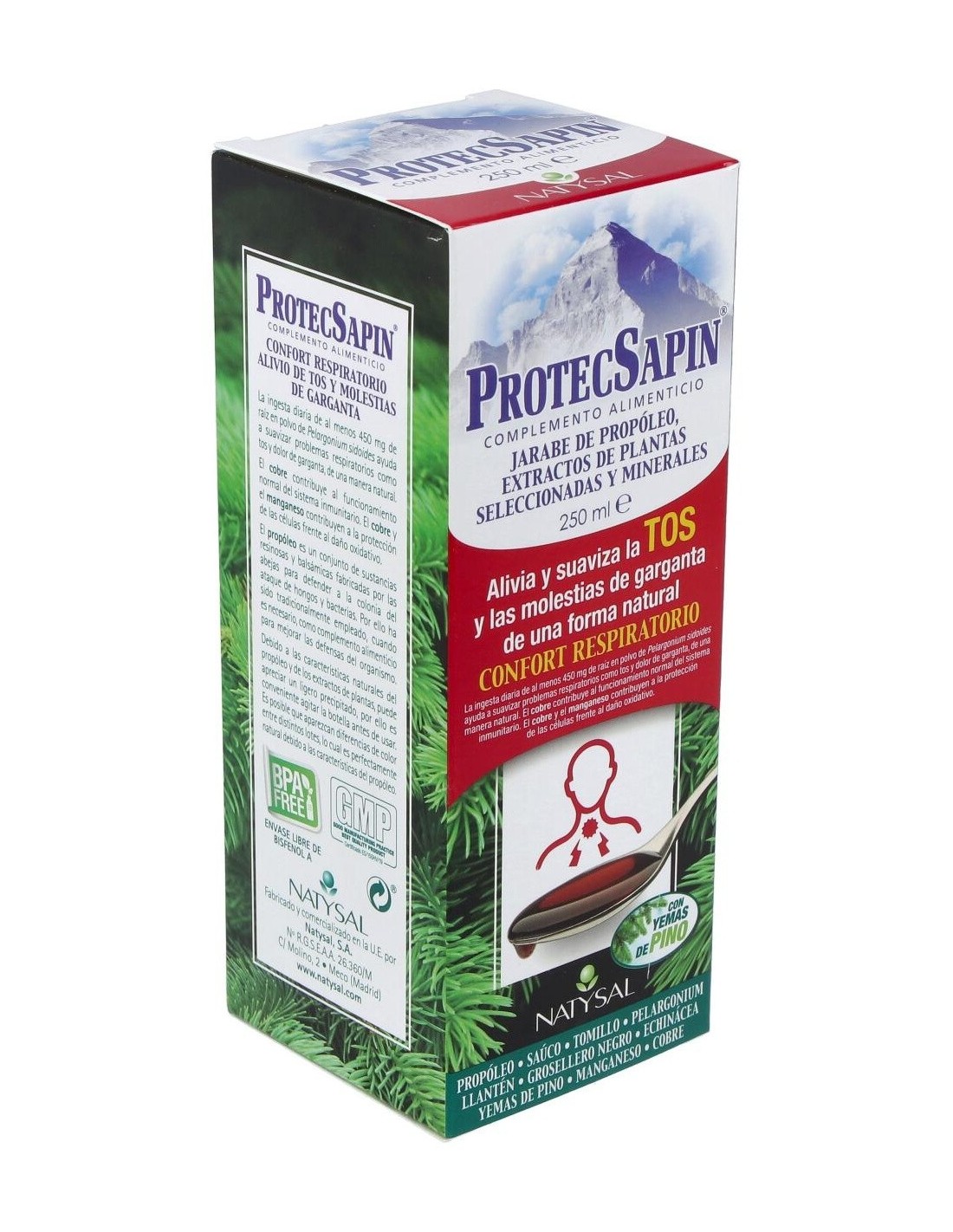 Protecsapin Jarabe (Regalo Comprimidos De Propolis Y C) 250 ml de Natysal es un complemento natural para personas que buscan apoyar su bienestar respiratorio, combinando jarabe con comprimidos de propóleos y vitamina C para una fórmula equilibrada.