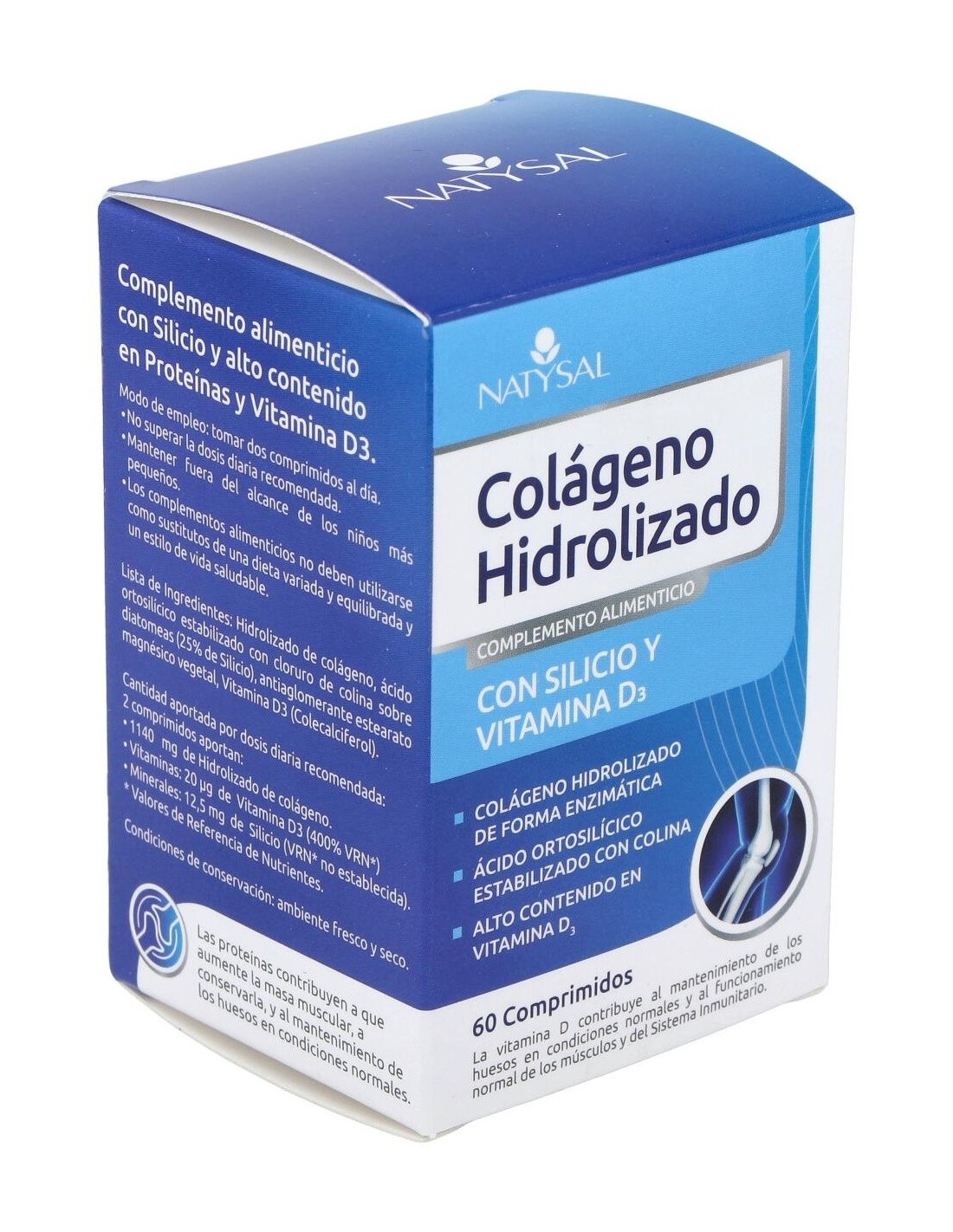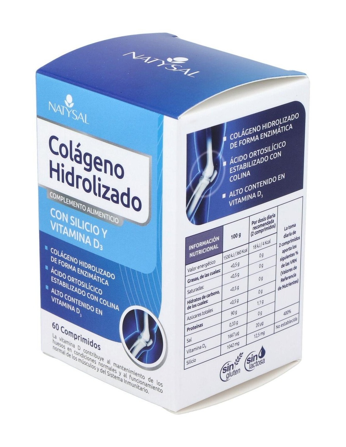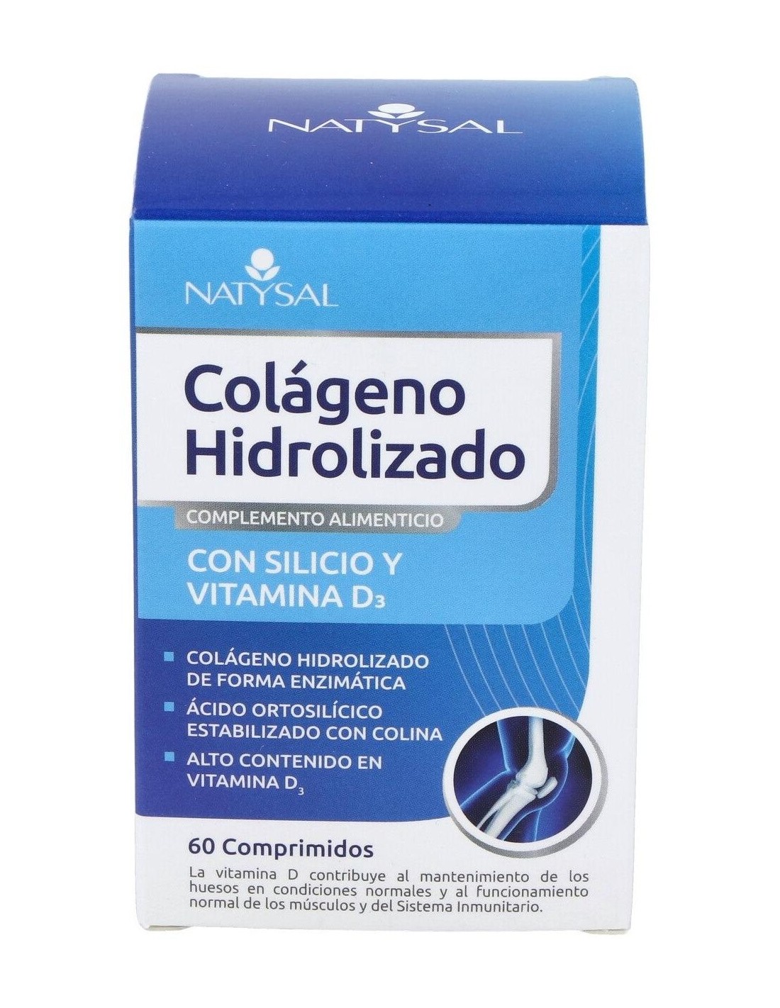 Colágeno Hidrolizado con Silicio y Vitamina D3 60 Comp. de Natysal es un suplemento diseñado para personas que buscan apoyar la salud de su piel, articulaciones y huesos mediante una fórmula que combina ingredientes específicos. Es adecuado para quienes desean complementar su dieta con componentes que contribuyen al mantenimiento estructural del organismo.