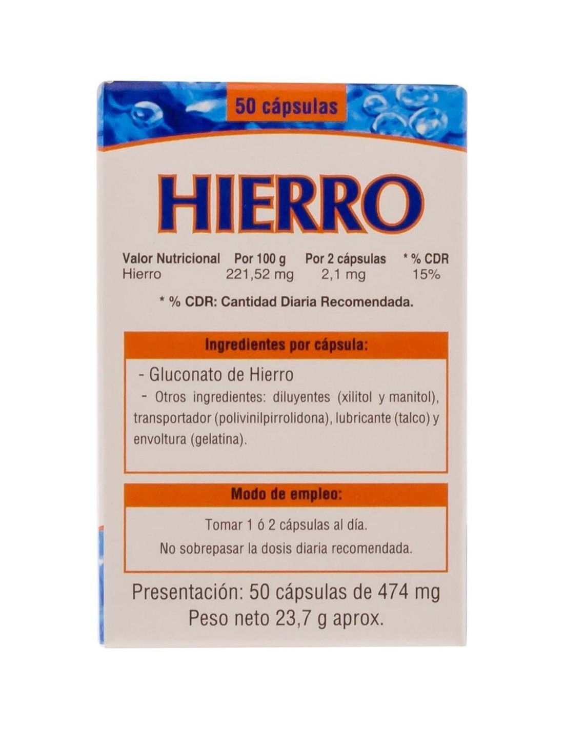 - Cada cápsula contiene una dosis precisa que contribuye a mantener niveles adecuados de hierro en el organismo.