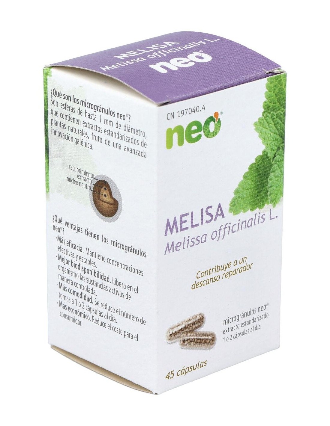 Melisa Microgranulos Neo 45Cap. de Neo es un suplemento diseñado para personas que buscan apoyar su bienestar diario mediante ingredientes naturales en una presentación práctica. Es adecuado para quienes prefieren una formulación en cápsulas que facilite su consumo habitual.