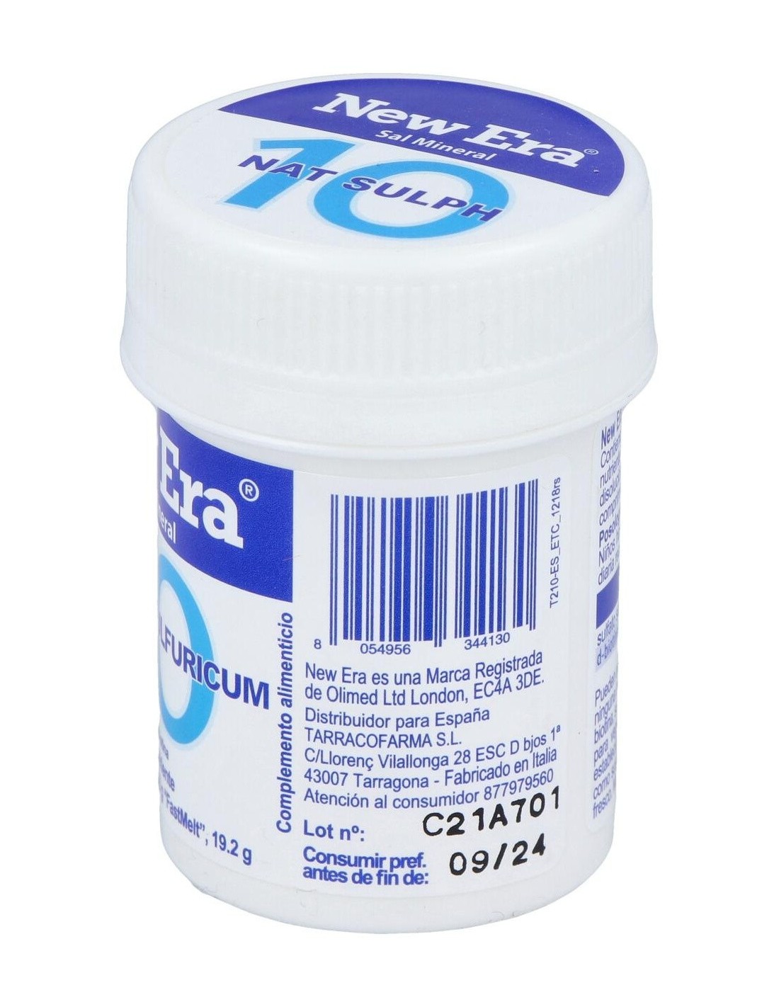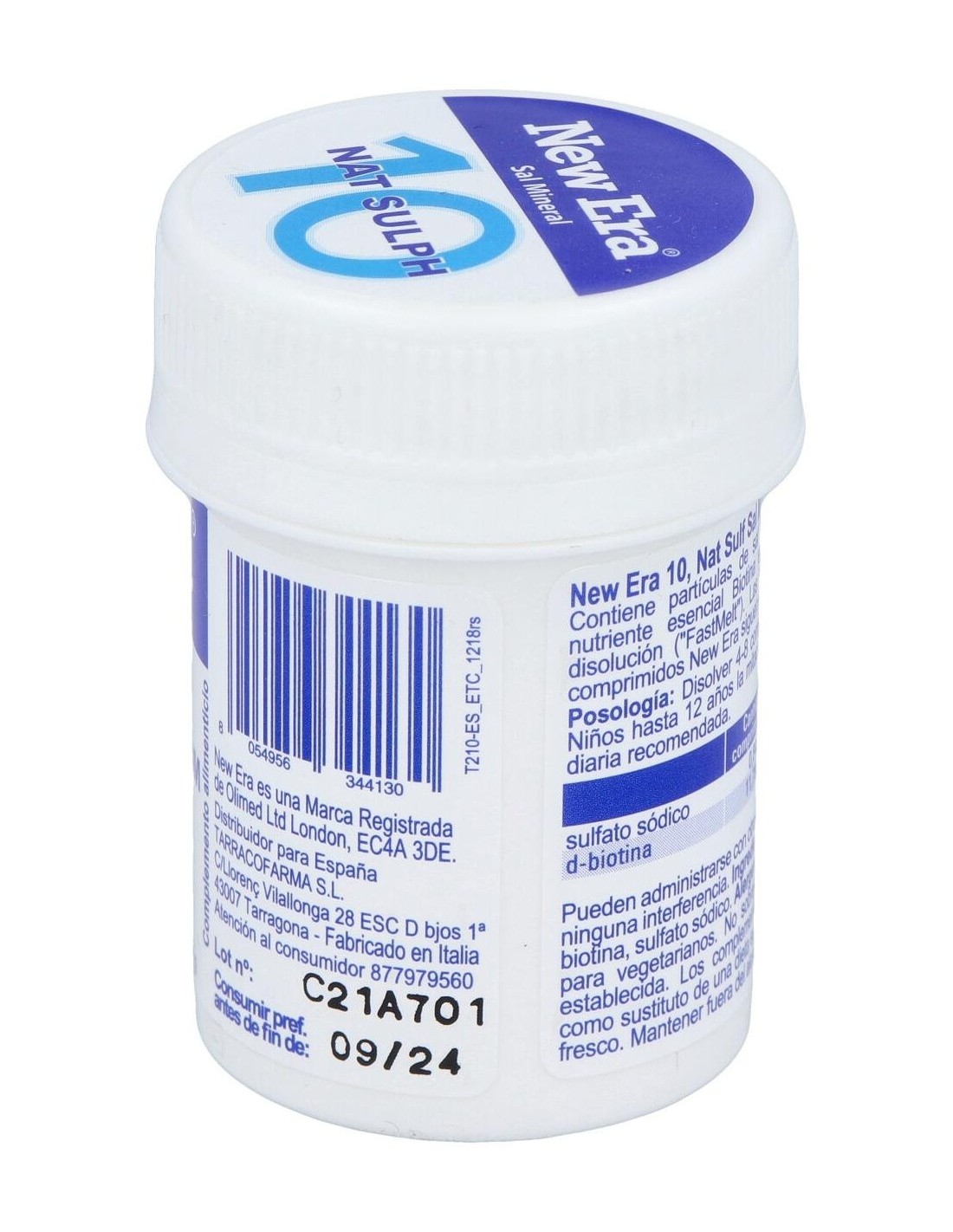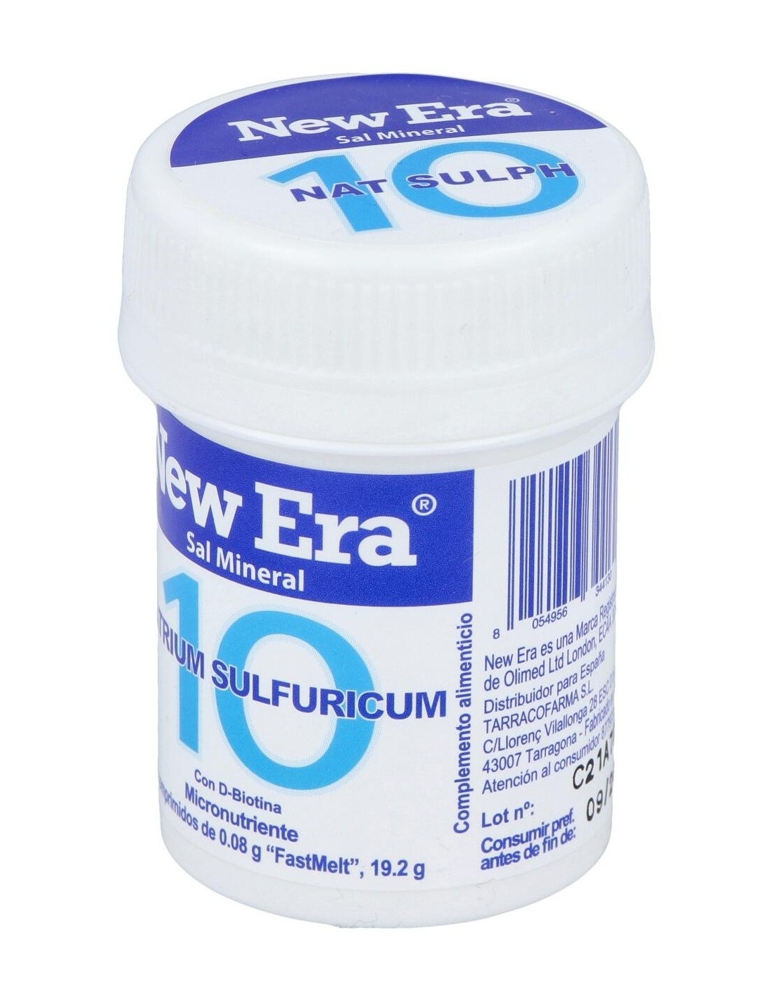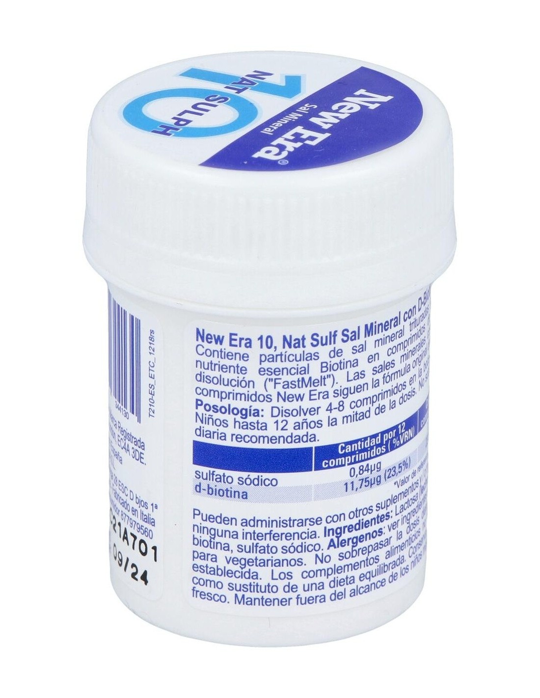 Sal de Schüssler Nr.10 Natrium sulfuricum (sulfato de sodio). Contiene partículas de sal mineral trituradas (molienda) y el nutriente esencial Biotina en comprimidos de fácil y rápida disolución ('FastMelt'). Las sales minerales contenidas en los comprimidos New Era siguen la fórmula original del Dr. Schüssler. Apto para vegetarianos.