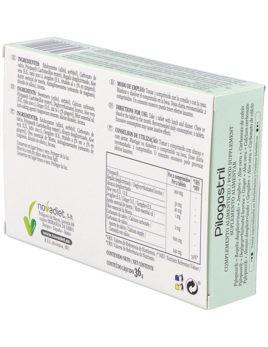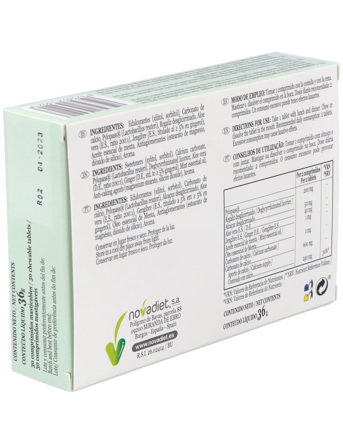 Edulcorantes (Xilitol, Sorbitol), Carbonato De Calcio, Pylopass® (Lactobacillus Reuteri), Regaliz Desglicirrizado, Aloe Vera (E.S., Ratio 200:1), Jengibre (E.S., Titulado Al = 5% En Gingerol), Aceite Esencial De Menta, Antiaglomerantes (Estearato De Magnesio, Dióxido De Silicio), Aroma.