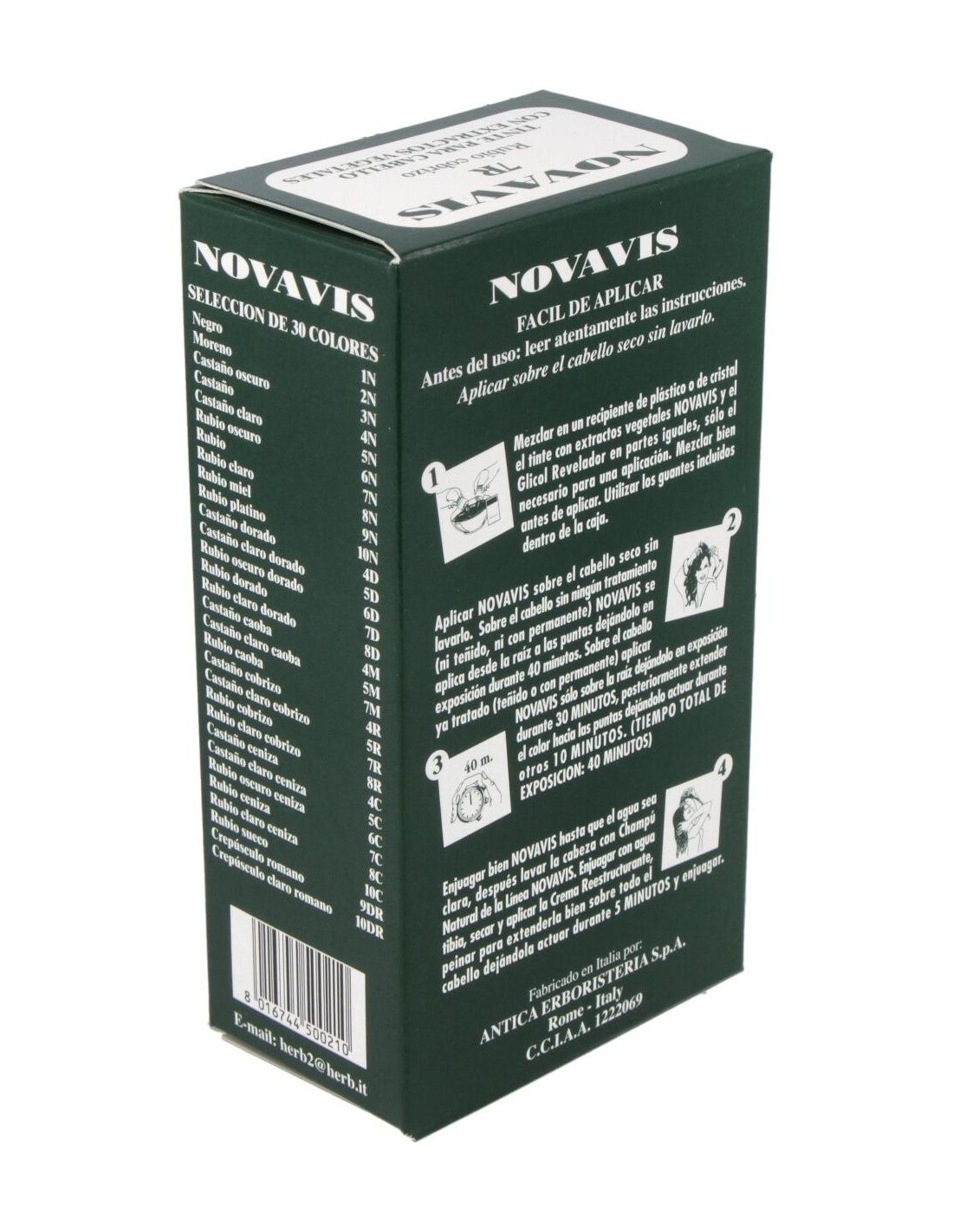 1. Mezclar en un recipiente de plástico o de cristal el tinte con extractos vegetales y el Glicol Revelador en partes iguales, sólo el necesario para una aplicación. Mezclar bien antes de aplicar. Utilizar los guantes incluidos dentro de la caja. 2. Aplicar sobre el cabello seco sin lavarlo. Sobre el cabello sin tratamiento ( ni teñido ni permanente). Se aplica desde la raíz a las puntas dejándolo en exposición durante 40 minutos. Sobre el cabello con teñido o permanente. Aplicar sólo sobre la raíz dejándolo en exposición durante 30 minutos. Posteriormente extender el color hacia las puntas dejándolo actuar durante otros 10 minutos. El tiempo total de exposición es de 40 minutos. 3. Enjuagar bien hasta que el agua sea clara, después lavar la cabeza con Champú Natural de Línea Novavis. Enjuagar con agua tibia, secar y aplicar la Crema Reestructurante, peinar para extenderla bien sobre todo el cabello dejándola actuar durante 5 minutos y enjuagar.