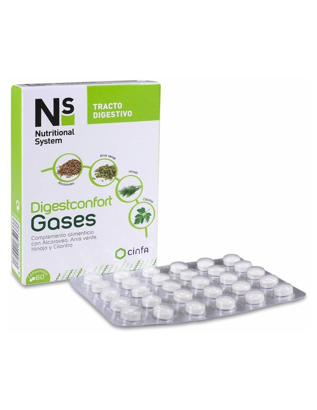 Estabilizantes: Celulosa microcristalina, Carboximetilceulosa sódica y Estearato de magnesio. Extracto seco de fruto de alcaravea (3% aceite esencial)(Carum carvi L.), Antiaglomerante: Díióxido de silicio. Edulcorante: Sucralosa. Aceite esencial del fruto de anís verde (80% trans-anetol)(Pimpinella anisum L.), Aceite esencial de partes aéreas de hinojo (15% trans-anetol)(Foeniculum vulgare Mill), Aceite esencial del fruto de cilantro (60% linalol)(Coriandrum sativum L.).