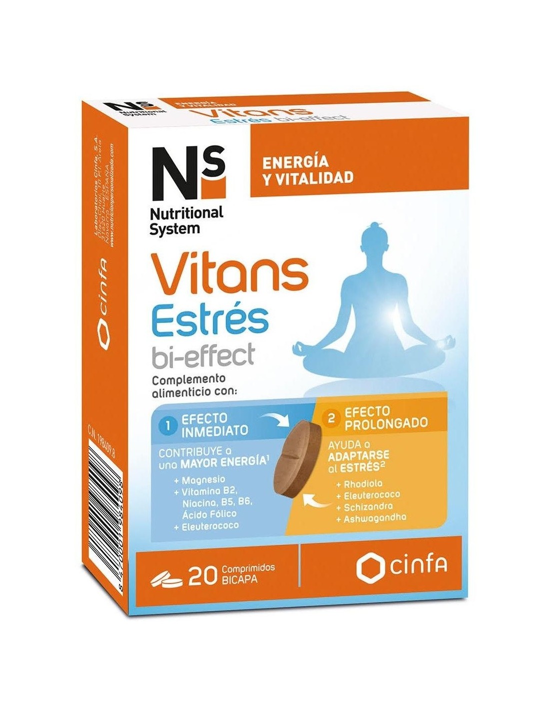 Complemento alimenticio para periodos de estrés gracias a su cuidada selección de ingredientes y a su exclusiva fórmula bi-effect, un innovador comprimido bicapa con doble efecto que consigue una liberación controlada de los ingredientes para actuar en cada momento necesario: Capa de liberación inmediata (beige), con activos que ayudan a disminuir el cansancio y la fatiga como el magnesio y algunas vitaminas del grupo B. Capa de liberación prolongada (marrón), con plantas adaptógenas como rhodiola y schizandra.