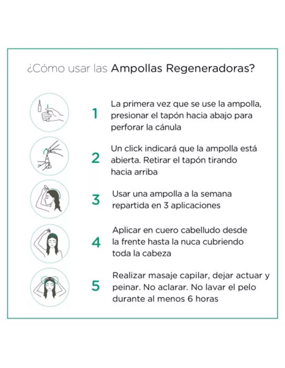 Ingredientes (INCI):Aqua, Alcohol Dent, Propylene Glycol, Placental Protein, Glycerin, Methylpropanediol, Hydrolyzed Soy Protein, Propanediol, Lepidium Meyenii Root Extract (andean maca), Glycogen (glycoenergizer hair), Biotin, Zinc Pca, Panthenol, Arginine Hcl, Glucose, Ornithine Hcl, Sorbic Acid, Pyridoxine Hcl, Glucosamine Hcl, Niacinamide, Citrulline, Caprylyl Glycol, Peg-40 Hydrogenated Castor Oil, Disodium Edta, Phenoxyethanol, Polyquaternium-11, Phenylpropanol, Chlorphenesin, Sodium Succinate, Sodium Hydroxide, Ci 19140, Ci 42090, Parfum, Citral, Limonene, Linalool.Modo de empleo:Cuando utilice la ampolla por primera vez, presione la tapa hacia abajo para perforar la cánula. Una vez abierta (escuchará un clic), retire la tapa tirando de ella.En cabellos secos: