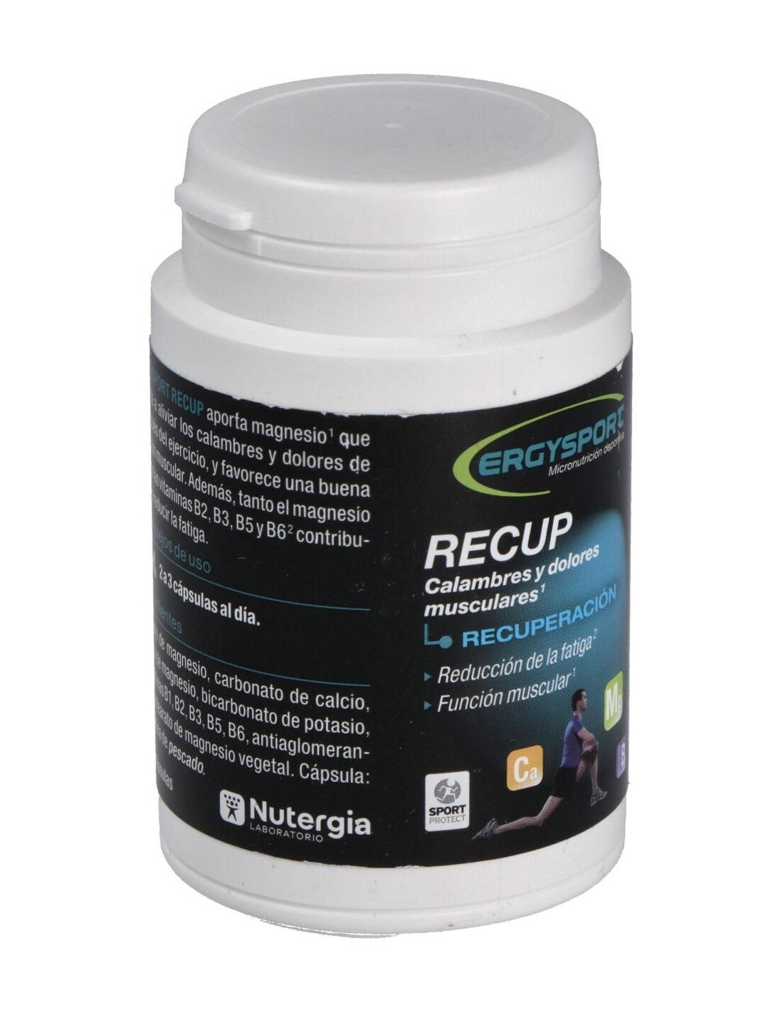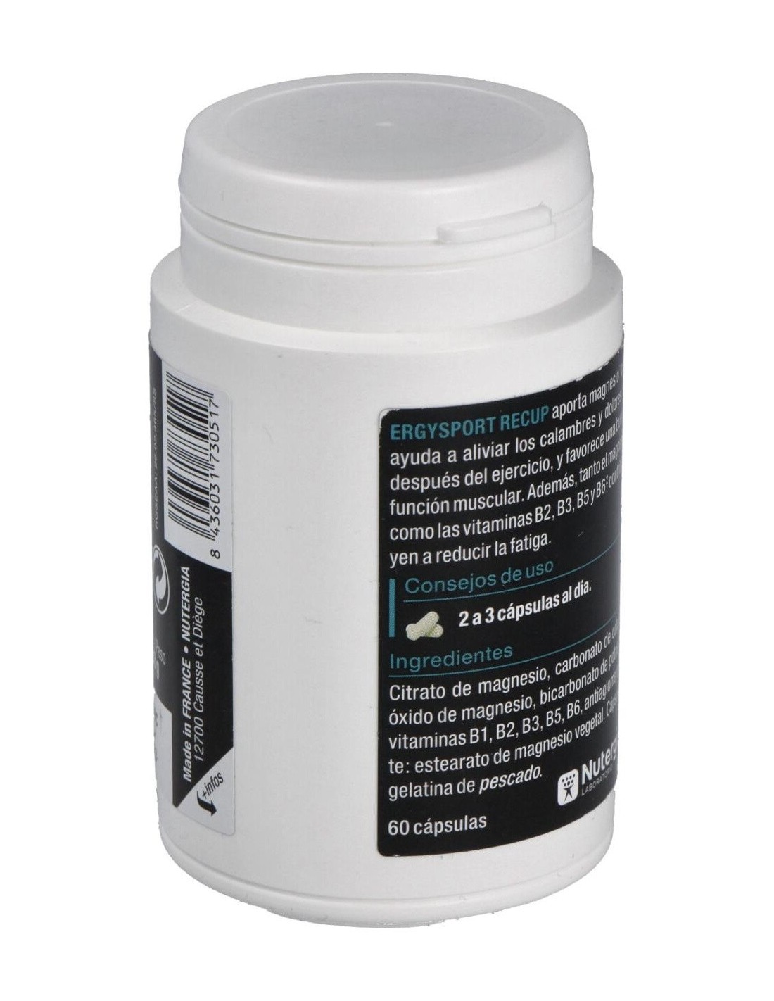 El Ergysport Recup 60Cap. de Nutergia es un complemento alimenticio para deportistas que contribuye a la recuperación muscular gracias a su fórmula equilibrada de aminoácidos y nutrientes esenciales.