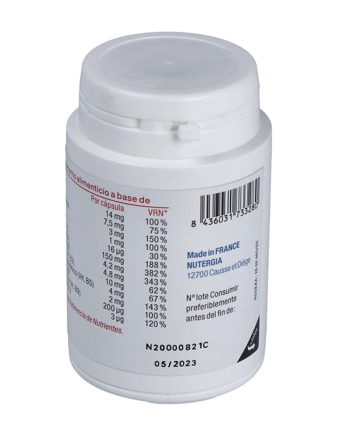 Composición:Ascorbato de calcio, cebada verde, alfalfa, maca, fumarato de hierro, vitaminas B1, B2, B3, B5, B6, B9, B12, citrato de manganeso, vitamina C, cobre y selenio. Modo de empleo:Tomar 1 ó 2 cápsulas al día con las comidas. Presentación:Bote de 60 cápsulas.