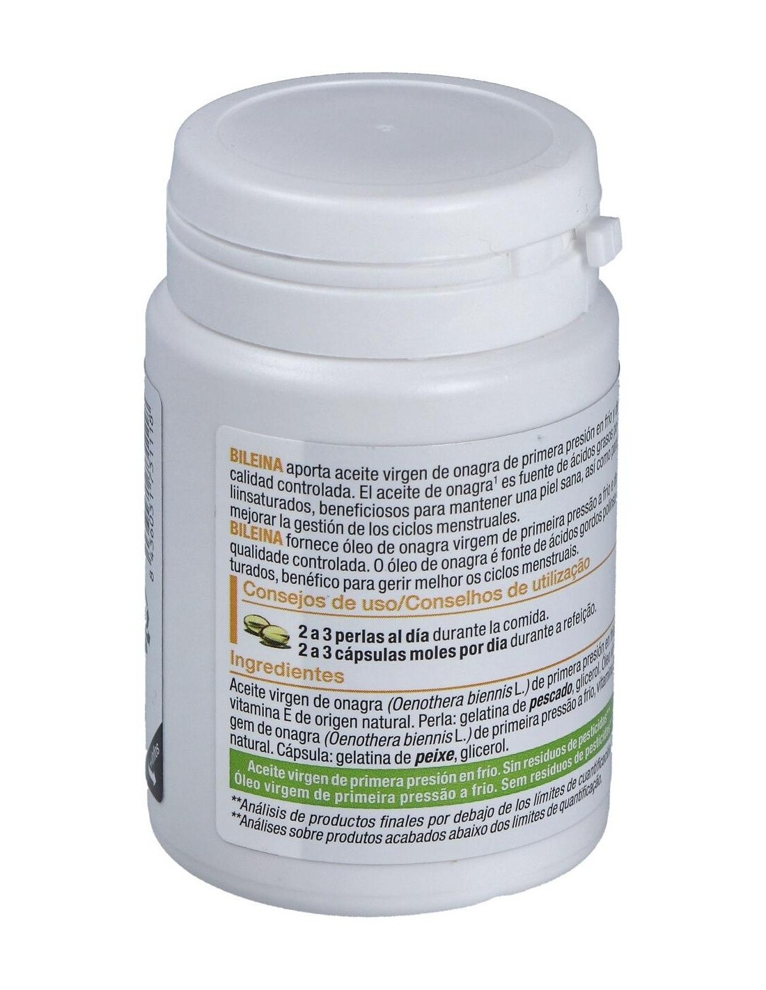 Aceite virgen de onagra (Oenothera biennis L.) de primera presión en frío, vitamina E de origen natural. Perla: Gelatina de pescado, glicerol.