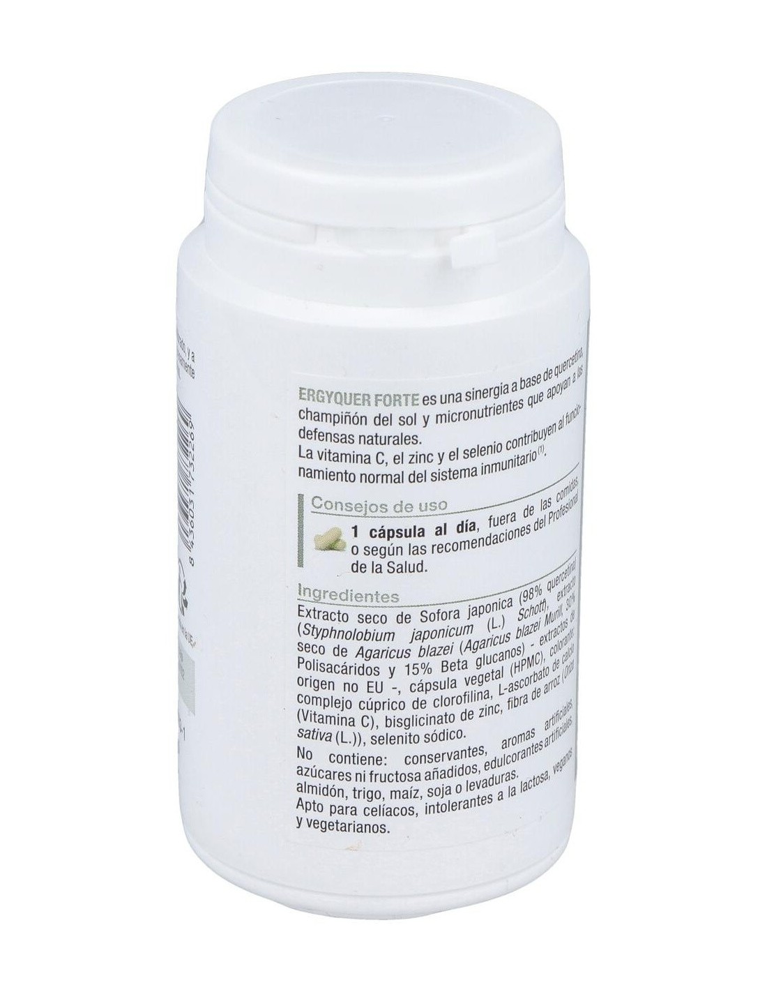 Schott), extracto seco BIO de Agaricus blazei (Agaricus blazei Murill, 30% Polisacáridos y 15% Beta glucanos) - extractos de origen no UE - cápsula vegetal (HPMC), colorante: complejo cúprico de clorofilina, L-ascor bato de calcio (Vitamina C), bisglicinato de zinc, fibra de arroz (Oriza sativa (L)), selenito sódico.