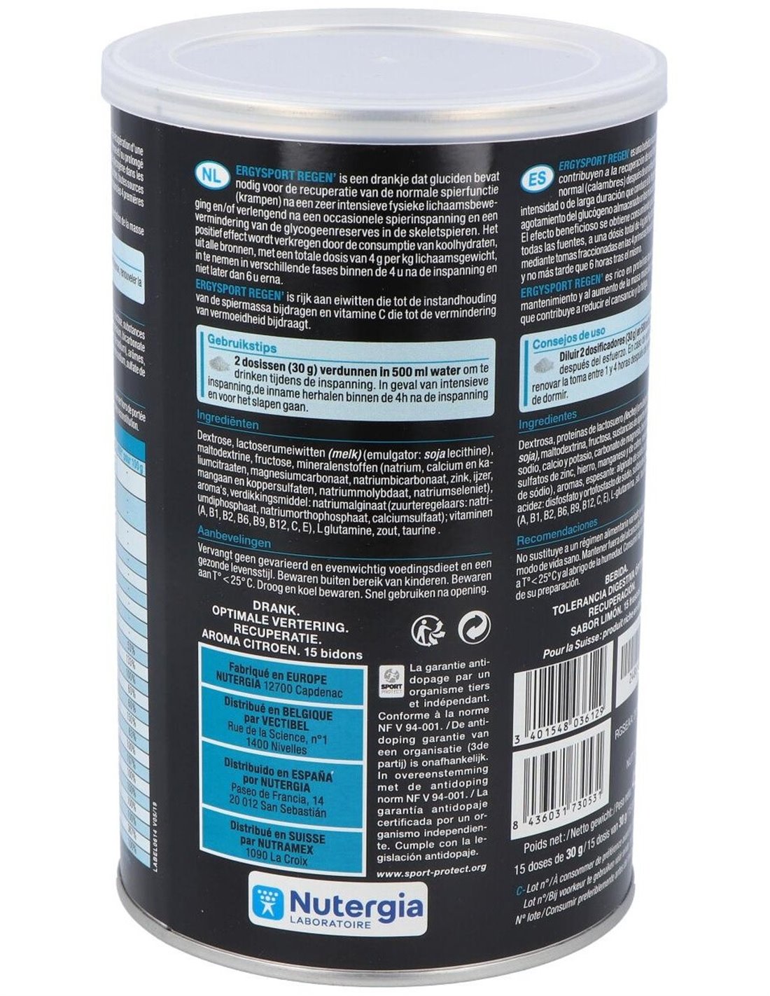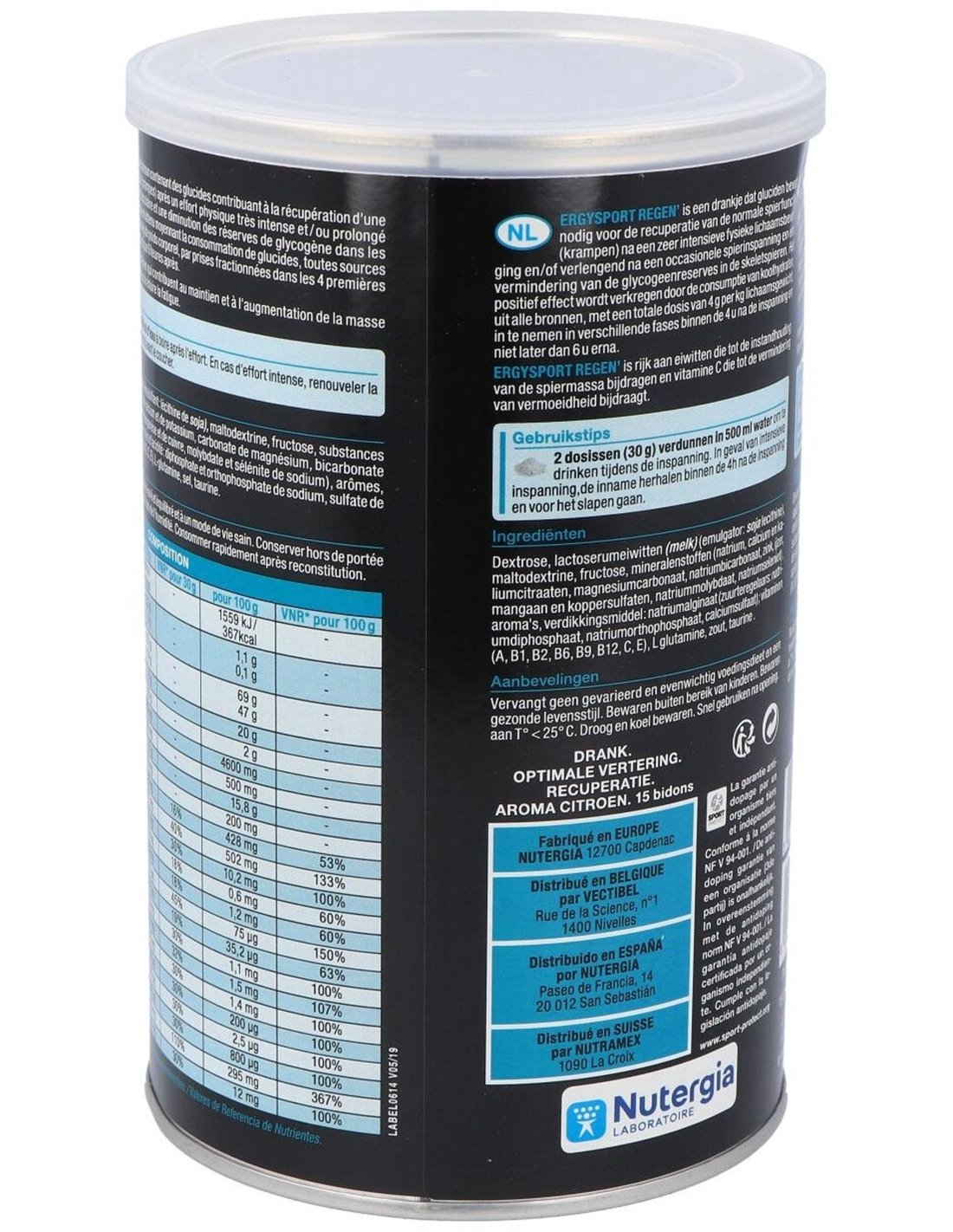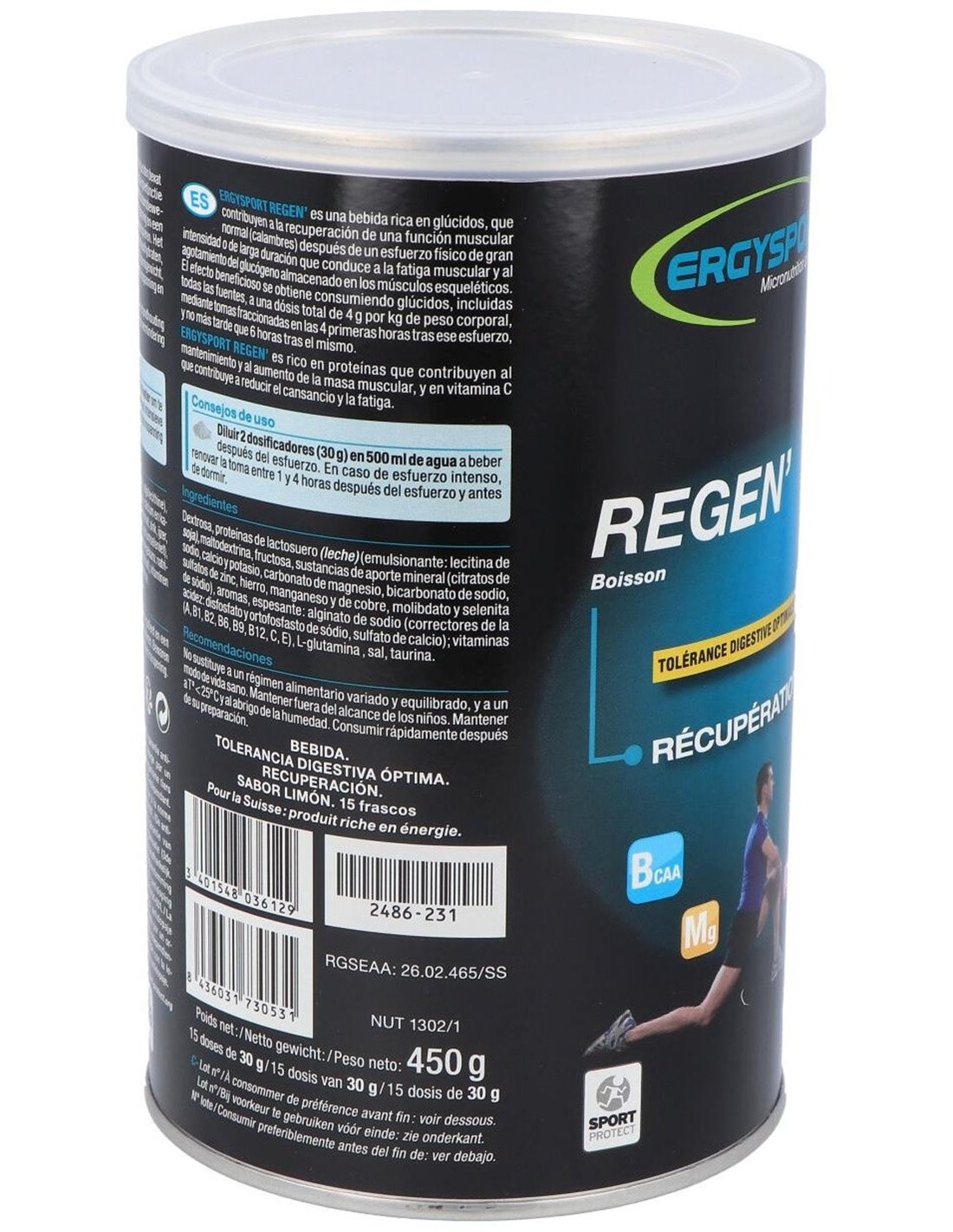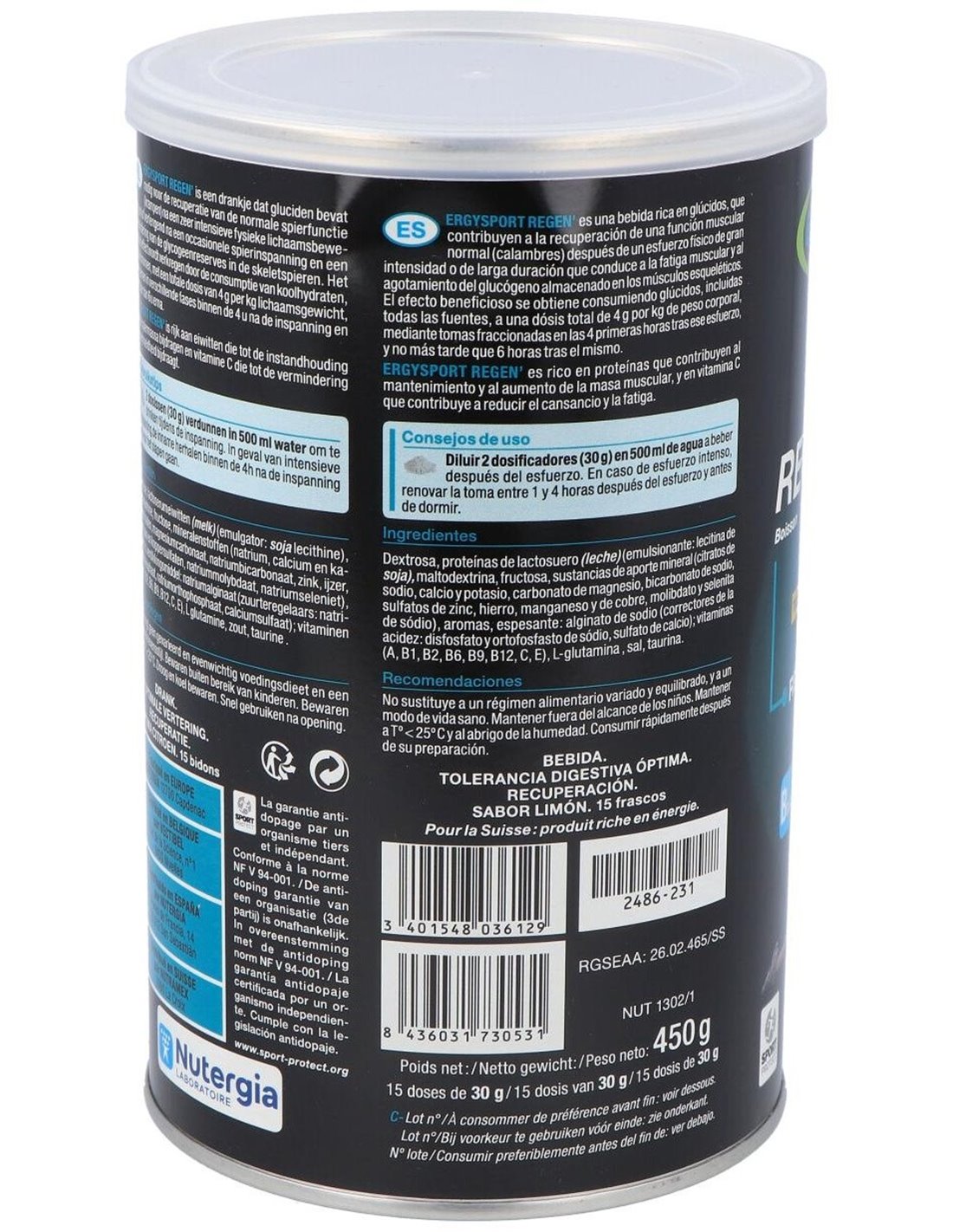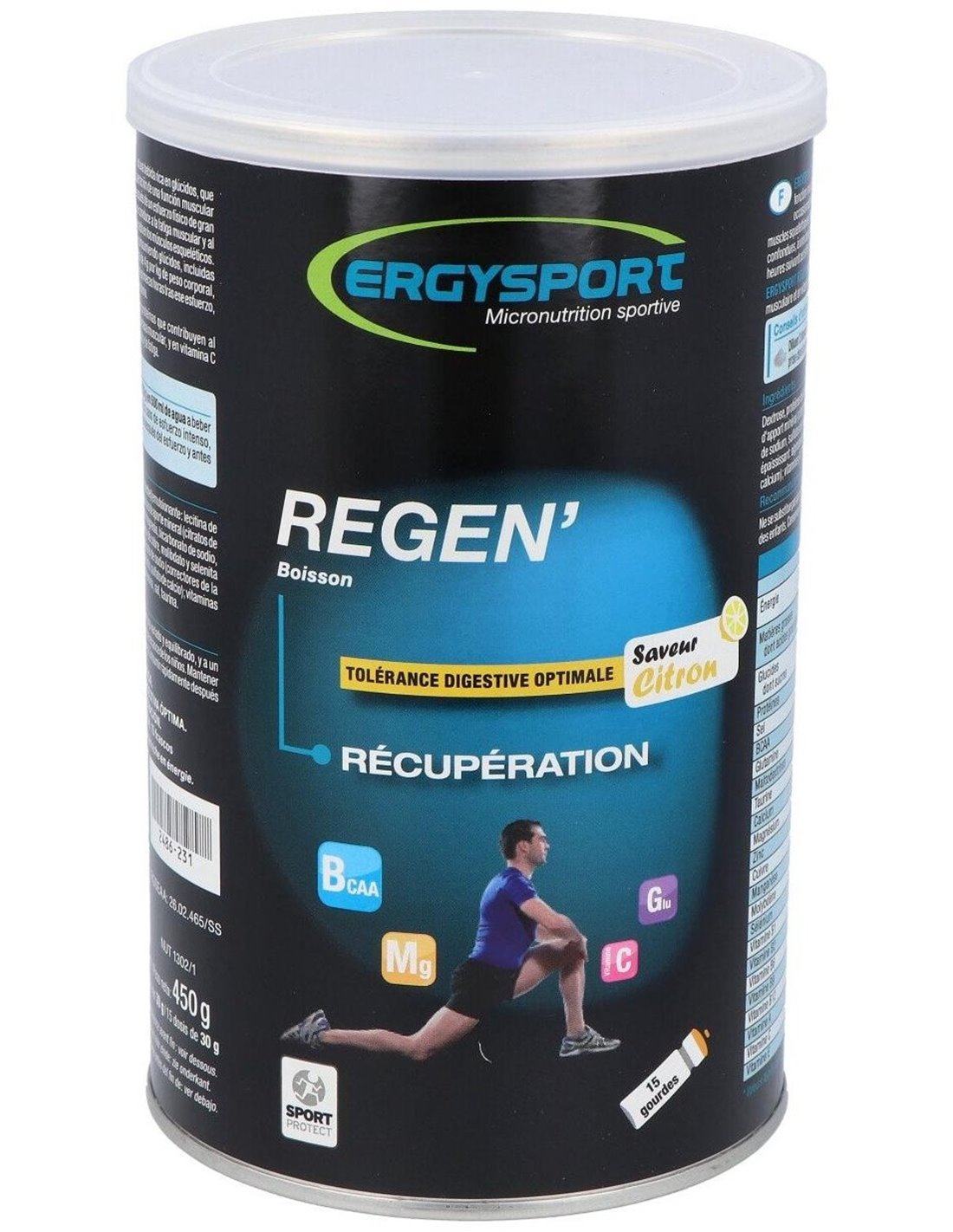 bicarbonato de sodio, gluconato de zinc, selenita de sodio, sulfatos de hierro, manganeso y cobre, molibdato de sodio), sabores naturales limón, espesante: alginato de sodio, glutamina, sal, vitaminas A, B1, B2, B6, B9, B12, C, E, taurina.