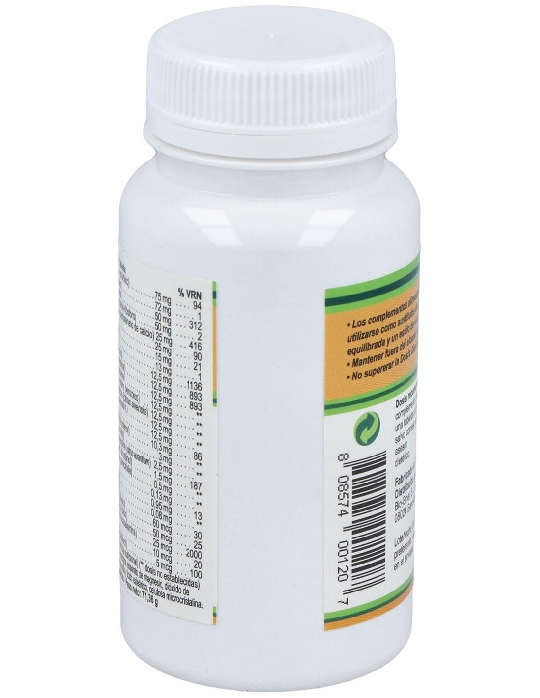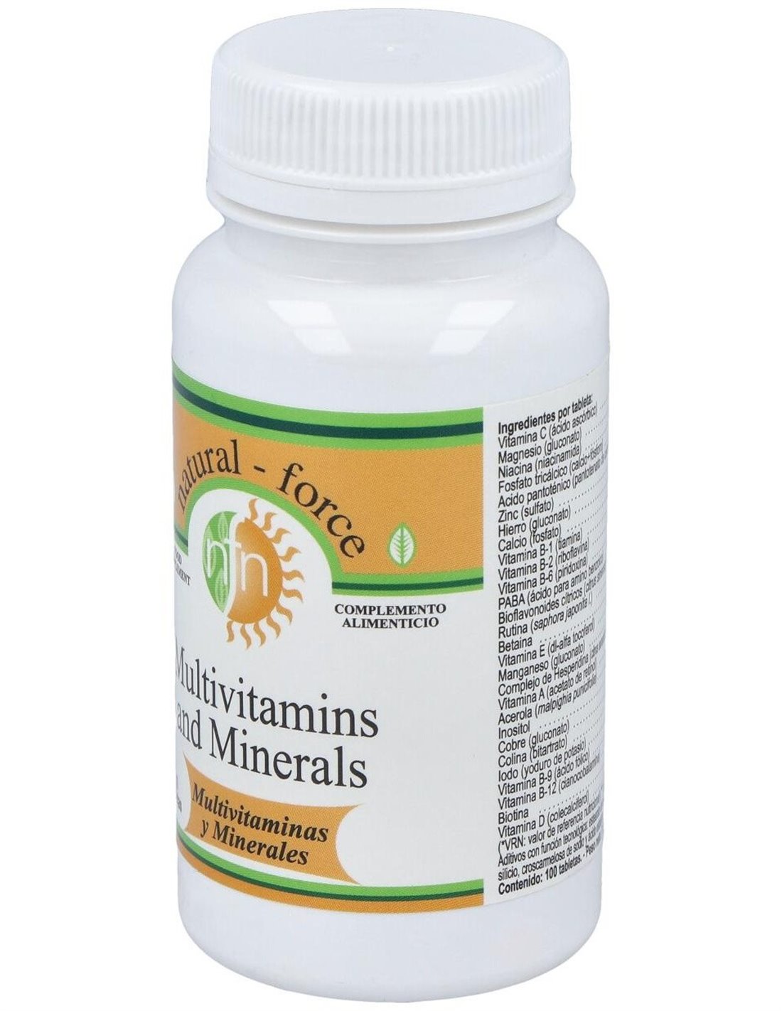 Por 1 comprimido: Vitamina C ... 75 mg. Vitamina B1 ... 12,5 mg. Vitamina B2 ... 12,5 mg. Vitamina B3 ... 50 mg. Vitamina B5 ... 25 mg. Vitamina B6 ... 12,5 mg. Vitamina B12 ... 50 µg. Biotina ... 10 µg. Ácido fólico ... 50 µg. PABA ... 12,5 mg. Vitamina A ... 1501 µg. Vitamina E (d-alfa tocoferol) ... 10,3 mg. Vitamina D .... 5 µg. Bioflavonoides cítricos ... 12,5 mg. Rutina ... 12,5 mg. Betaína ... 12,5 mg. Complejo de hesperidina ... 2,5 mg. Colina bitartrato ... 0,08 mg. Inositol ... 0,13 mg. Zinc sulfato ... 9 mg. Fósforo (fosfatod e calcio) ... 7 mg. Magnesio gluconato ... 3,6 mg. Hierro gluconato ... 3 mg. Manganeso gluconato ... 3 mg. Iodo (yoduro de potasio) ... 50 µg. Cobre gluconato ... 0,13 mg. Acerola ... 0,5 mg. Estearato de magnesio, dióxido de calcio, cocramelosa de sodio, ácido esteárico, celulosa microcristalina.