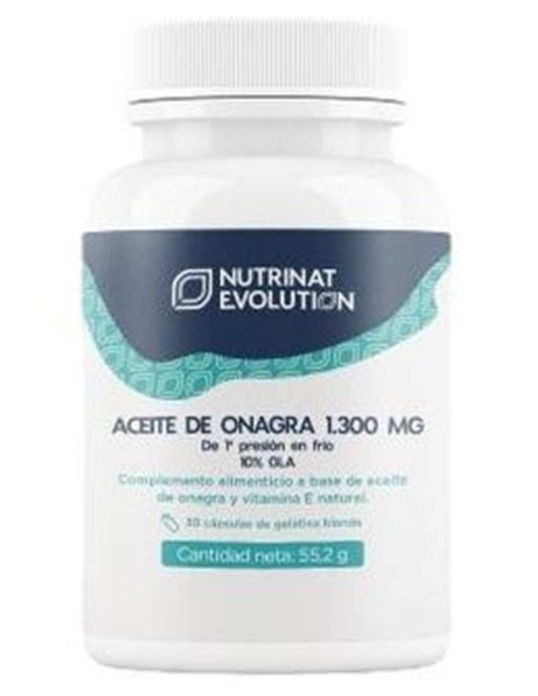 El Aceite de Onagra de 1.300 mg de Nutrinat Evolution es una fórmula a base de aceite de onagra obtenido por presión mecánica y en frío de las semillas, rica en ácidos grasos poliinsaturados de la serie omega 6; concretamente aporta un 10% de GLA (ácido gamma linolénico) y 65% en ácido linoleico. La fórmula incluye vitamina E en forma de d-alfa-tocoferol.El aceite de onagra es muy sensible a la oxidación; por ello se suele asociar a la vitamina E, que ayuda a frenar ese proceso y aporta un efecto antioxidante, brindando protección a las células frente al envejecimiento.Aplicaciones: