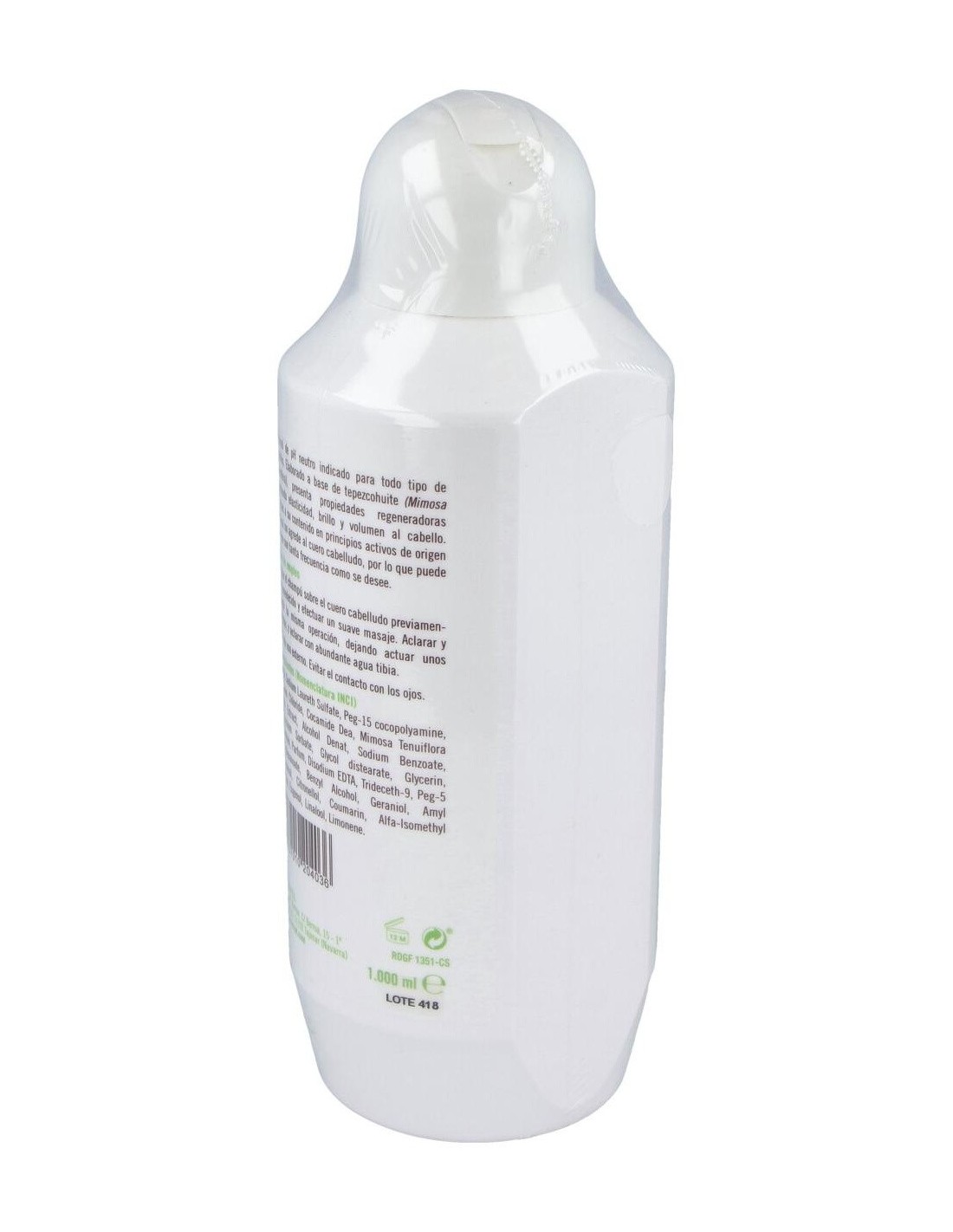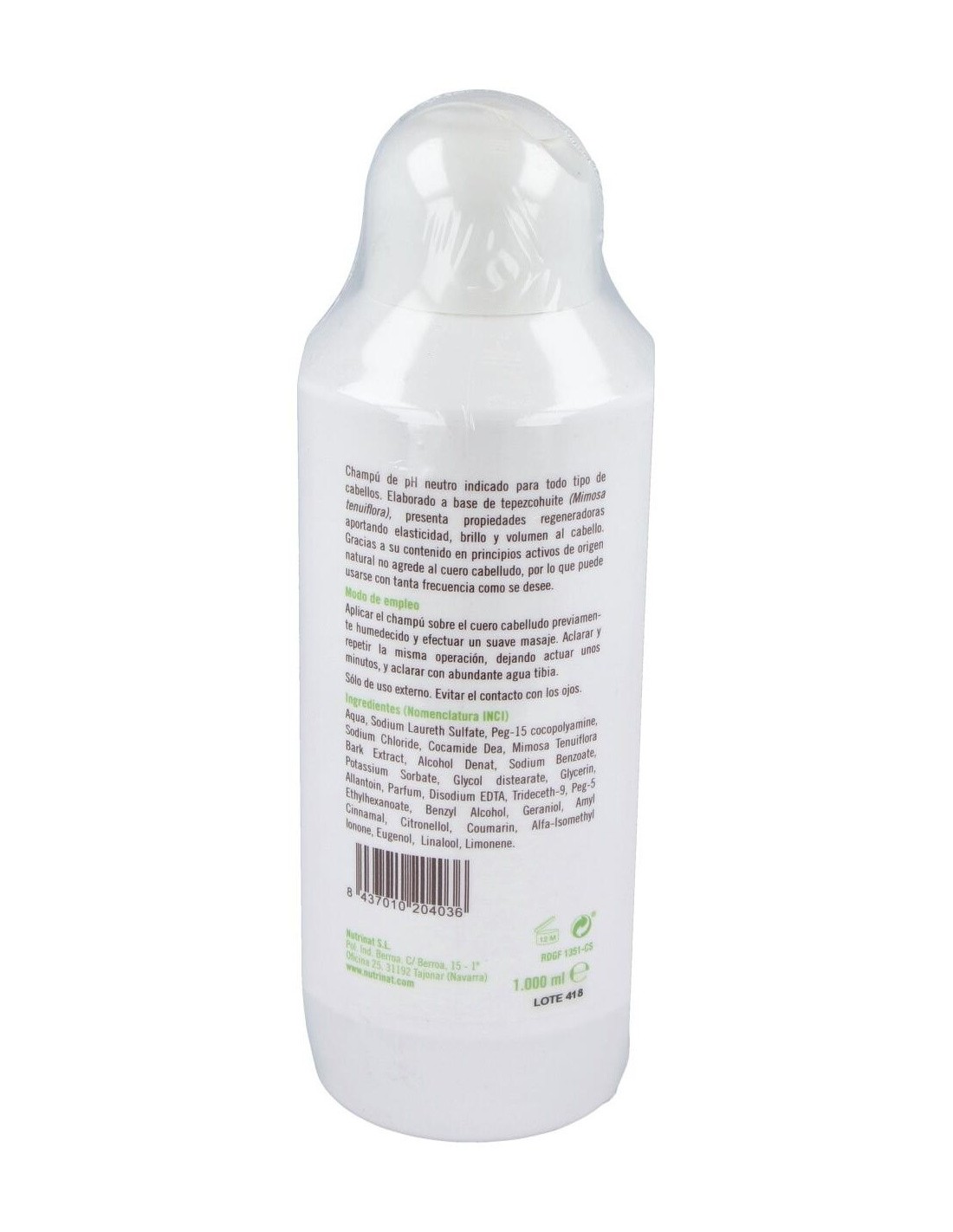 Champú Tepezcohuite Nutrionat de pH neutro puede ser utilizado en todo tipo de cabellos, proporcionando elasticidad, brillo y volumen. No agrede el cu