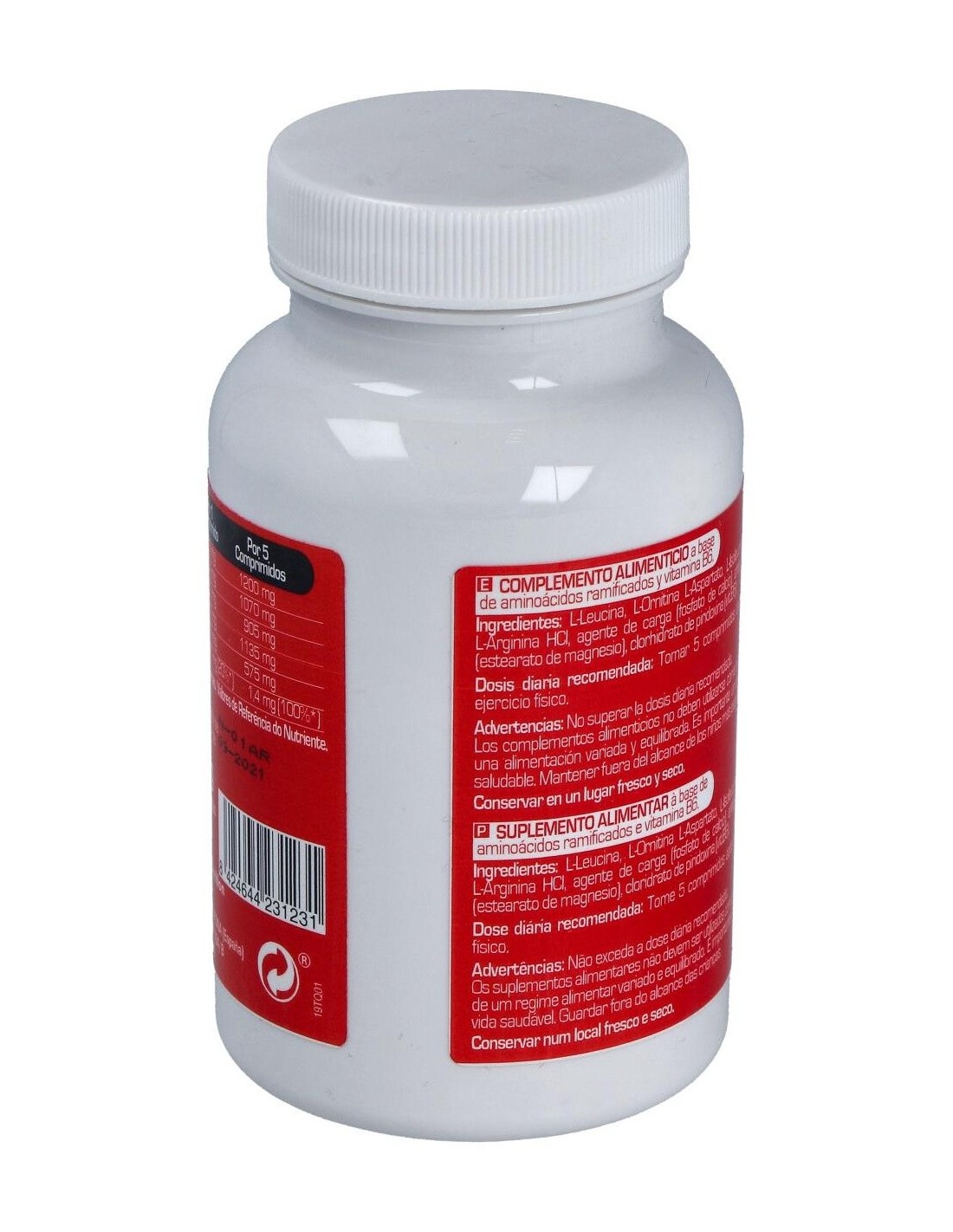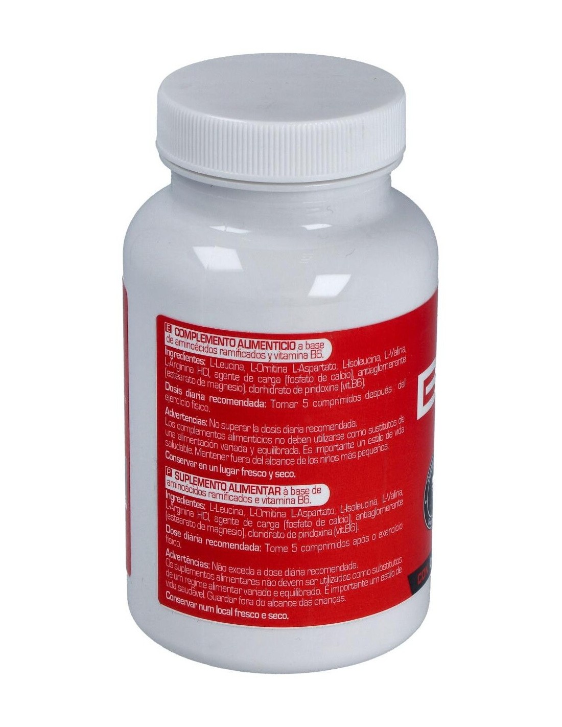 L-Leucina (21%), L-Ornitina, Aspartato (20%), L-Isoleucina (19%), L-Valina (16%), L-Arginina Clorhidrato (12,5%), Agente de Carga (Fosfato Cálcico), Lubricante (Estearato de Magnesio Vegetal), Piridoxina Clorhidrato.