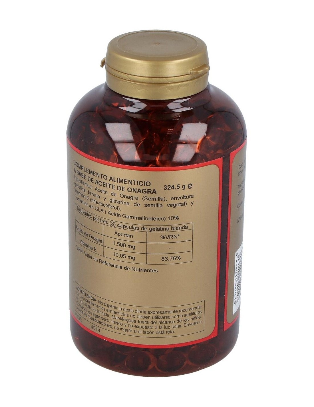Complemento alimenticio a base de aceite de Onagra que posee las siguientes propiedades: destaca por su riqueza en ácidos grasos esenciales. Contiene ácido oleico, importante para la salud del corazón y de las arterias. Ayuda a reducir los síntomas pre-menstruales. Ayudando a la ovulación y a regular los ciclos menstruales. Ayuda en trastornos de la piel también es usado; eccema, psoriasis y acné.