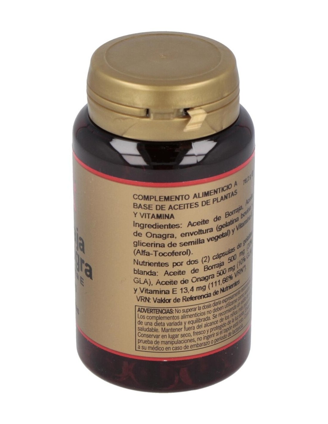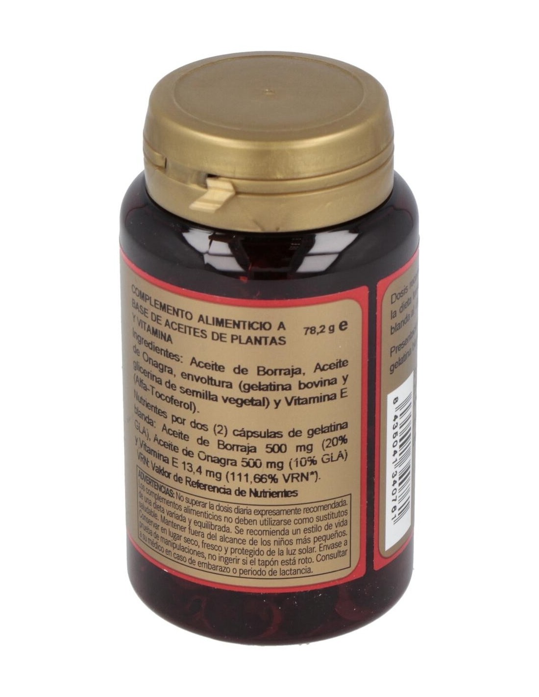 Complemento alimenticio elaborado a base de vitamina E y aceites de borraja y onagra. Fórmula rica en ácidos grasos esenciales. Favorecen el correcto mantenimiento y equilibrio fisiológico de la piel. A la sinergia de estos aceites se le atribuyen propiedades de regulación hormonal. Indicado para adultos.