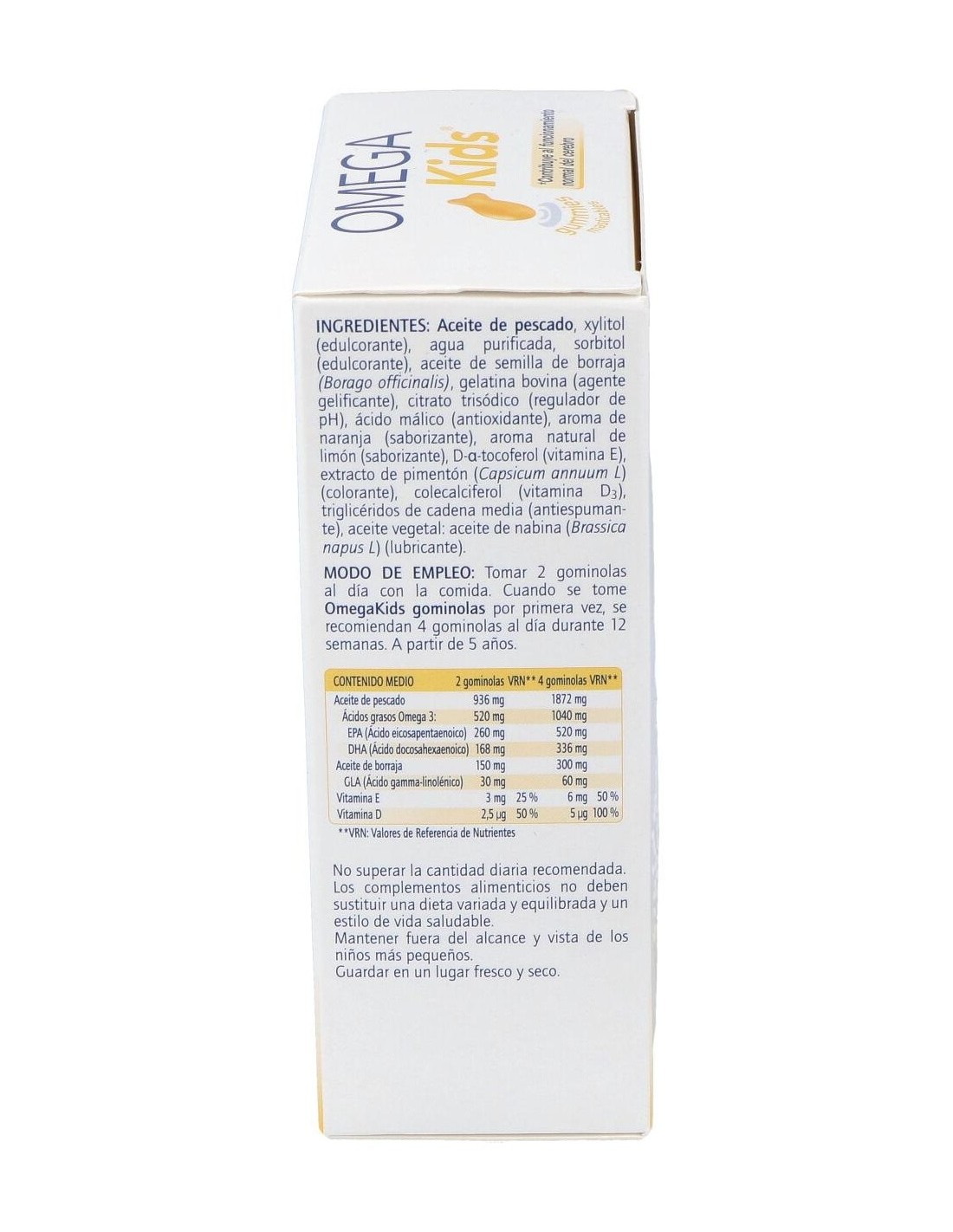 Aceite de pescado, xilitol (edulcorante), agua purificada, sorbitol (edulcorante), aceite de semilla de borraja (Borago officinalis), gelatina bovina (agente gelificante), citrato trisódico (regulador de pH), ácido málico (antioxidante), aroma de naranja (saborizante), aroma natural de limón (saborizante), D-a-tocoferol (vitamina E), extracto de pimentón (Capsicum annuum L) (colorante), colecalciferol (vitamina D3 ), triglicéridos de cadena media (antiespumante), aceite vegetal: aceite de nabina (Brassica napus L) (lubricante).