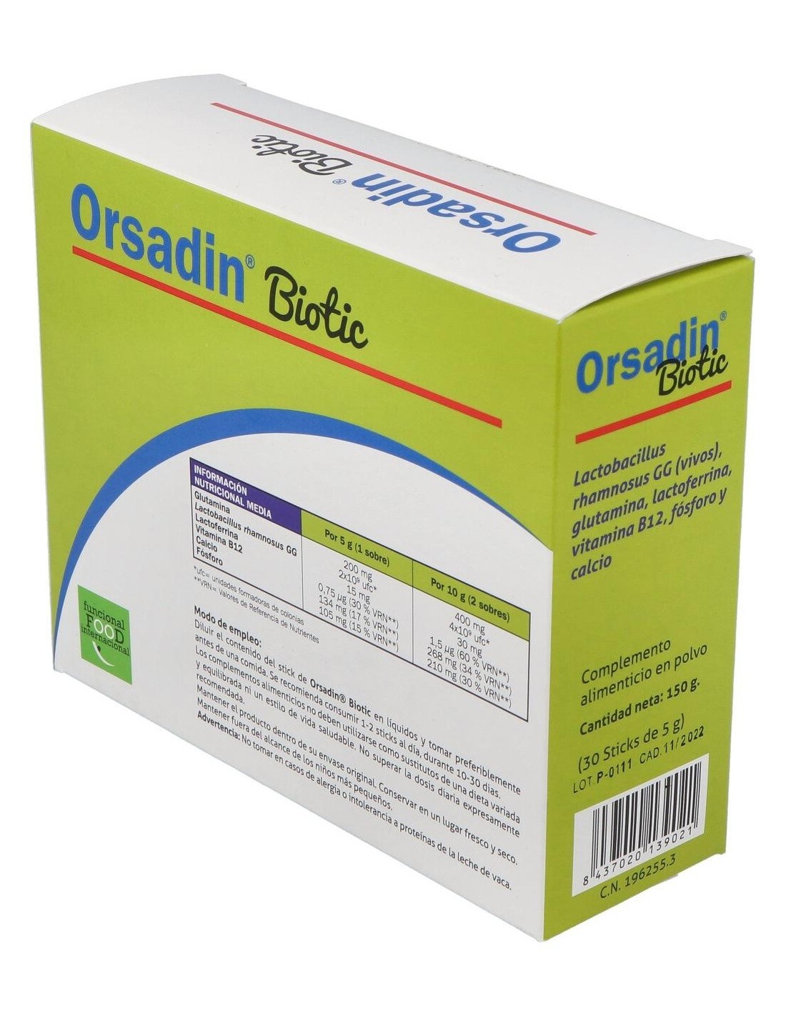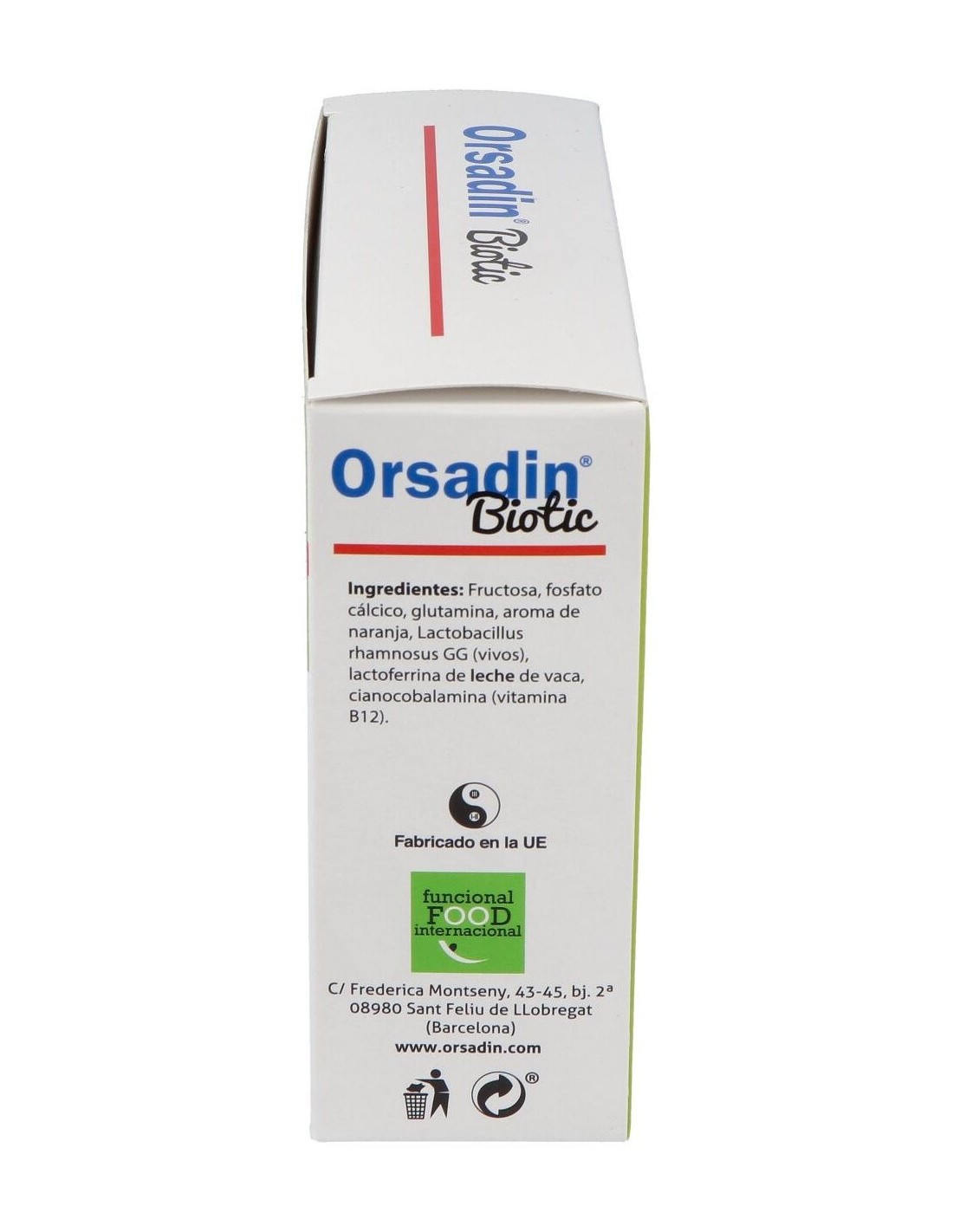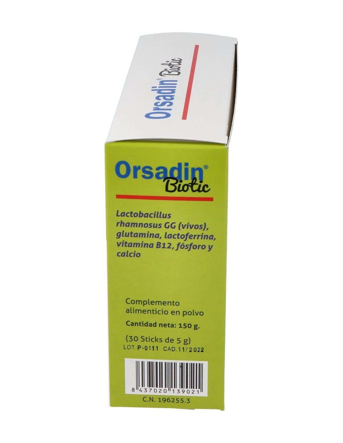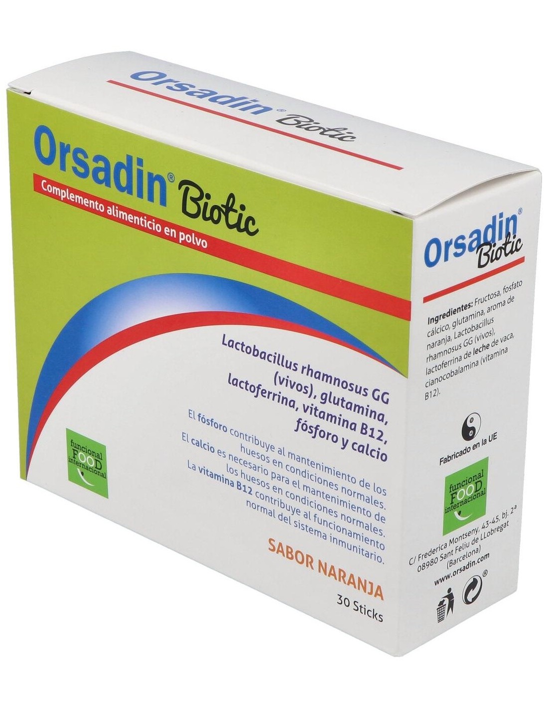 Complemento alimenticio infantil en polvo con Lactobacillus rhamnosus GG (vivos), glutamina, lactoferrina, vitamina B12, fósforo y calcio. La vitamina B12 contribuye al normal metabolismo energético. Sabor naranja.