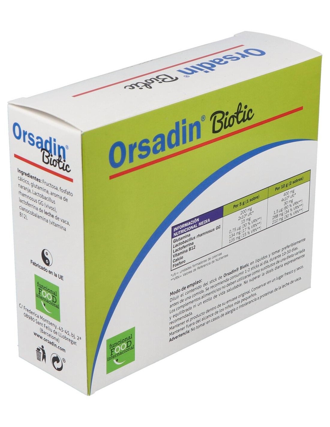 Fructosa, fosfato cálcico, glutamina, aroma de naranja, Lactobacillus rhamnosus GG (vivos), lactoferrina de leche de vaca, cianocobalamina (vitamina B12). Por 1 sobre: Glutamina .......................................200 mg Lactobacillus rhamnosus GG.............. 2x10(9) ufc Lactoferrina ....................................15 mg Vitamina B12...................... 0,75 µg Calcio ................................134 mg Fósforo.............................. 105 mg