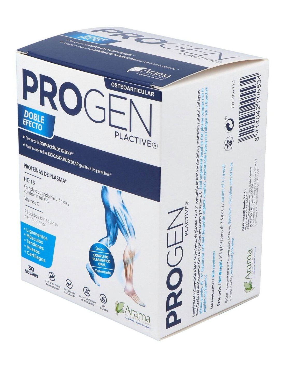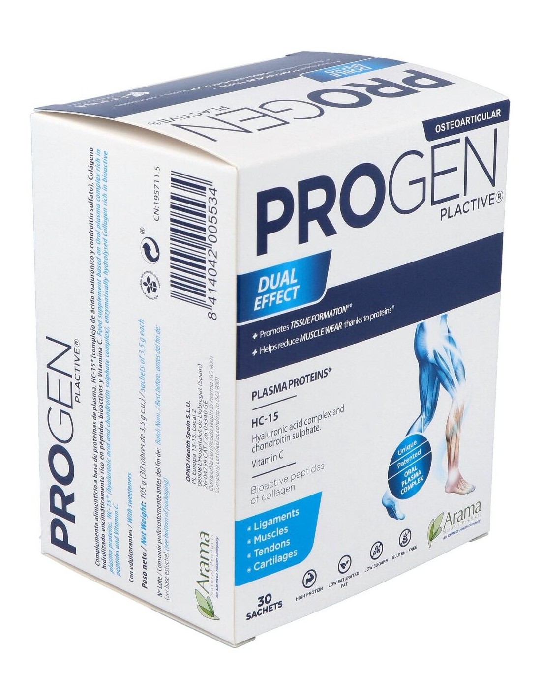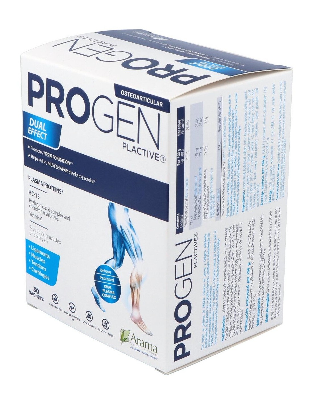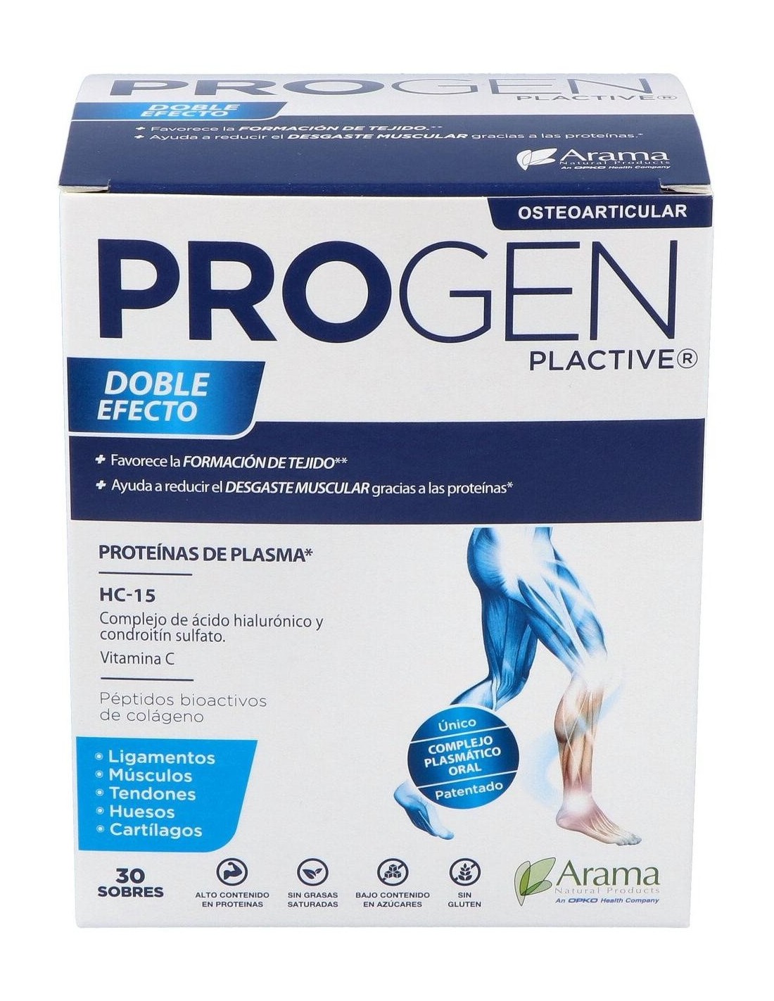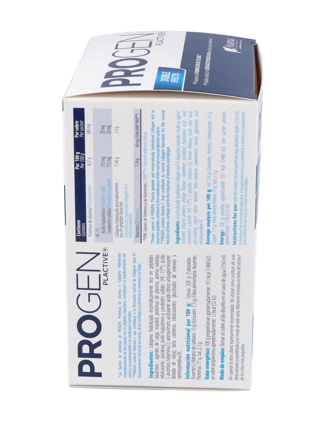 Este compuesto sirve principalmente para ayudarnos en la recuperación de lesiones traumáticas y procesos degenerativos del sistema musculoesquelético: articulaciones, tendones, ligamentos, huesos, músculos y fascias. ¡Controla el desgaste muscular de forma natural! Propiedades y Beneficios de Progen PlactiveProteínas de plasmaEl plasma es rico en rico en proteínas bioactivas como la albúmina, factores tróficos y minerales que favorecen el mantenimiento de la estructura musculoesquelética: Articulaciones, músculos, tendones, ligamentos, fascias y huesos. Las proteínas de plasma son claves en la generación de tejido muscular, tendinoso y condral y esenciales en la recuperación de lesiones traumáticas articulares y procesos degenerativos como la artrosis. Las proteínas de plasma son muy saludables a nivel intestinal. Sus componentes protegen la salud de la mucosa intestinal, mejorando la tolerancia gastrointestinal y aumentando la eficiencia del intestino para absorber los nutrientes que serán más aprovechables por las células de las articulaciones, los músculos y otros tejidos. Demostrado: en un estudio llevado a cabo con Proteínas de plasma se demuestra que es efectivo en la reducción del dolor y mejora de la calidad de vida en pacientes con artrosis de rodilla, habiendo una mejoría significativa a los 15 días de tratamiento. HC-15® - Complejo de ácido Hialurónico y Condroitín sulfatoHC-15® es un complejo de ácido Hialurónico y Condroitín sulfato patentado que permite mejorar la viscosidad y la efectividad del ácido hialurónico. Al estar unido al Condroitín sulfato, se protege frente a la oxidación fisiológica a la que está expuesto en nuestro organismo, por lo que mejora notablemente su acción con respecto a la molécula de ácido Hialurónico sola. El ácido Hialurónico es el principal componente del líquido sinovial, siendo el responsable de las propiedades viscoelásticas y lubricantes del fluido, presente en articulaciones móviles, tendones y ligamentos. En las articulaciones, es sintetizado por unas células llamadas fibroblastos sinoviales de tipo B, células especializadas de la membrana sinovial que cierra el espacio intraarticular. En los procesos de degeneración articular o artrosis, la viscosidad del líquido sinovial disminuye por la reducción tanto del peso molecular como de la concentración del ácido Hialurónico. Esto favorece el rozamiento entre las superficies articulares (cartílago) y su desgaste, así como la acción de agentes inflamatorios como el TNF-a(Factor de Necrosis Tumoral a) y la IL-1ß(Interleuquina-1ß), que agravan la inflamación y el dolor articular. El ácido Hialurónico está presente también en la matriz del cartílago articular y es sintetizado por los condrocitos (células especializadas del cartílago), siendo esencial para mantener su integridad estructural. El aporte nutricional de ácido Hialurónico, ayuda a: